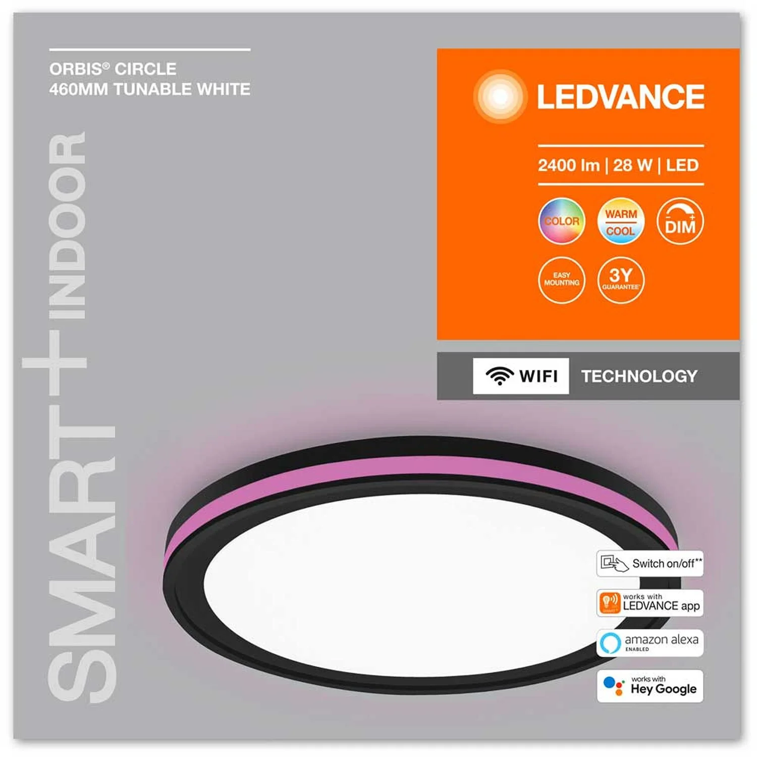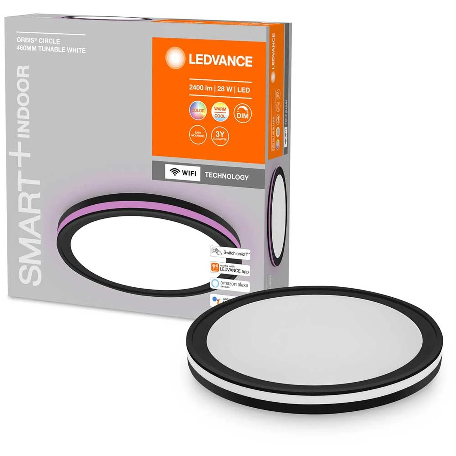 Die smarte Dekodeckenleuchte mit Haupt- und Seitenlicht ist mit der RGBTW-Technologie sowie WiFi-Technologie ausgestattet und dimmbar. Sie ist über die Smart+ WiFi-App von Ledvance (mit mindestens Android 4.4 oder iOS 9.0) steuerbar. Es ist auch eine Steuerung über Google Assistant oder Amazon Alexa möglich. Die Farbtemperatur ist über Tunable White von 3’000 – 6’500 K einstellbar. Die Installation ist einfach und im Handumdrehen erledigt. Haupt- und Seitenlicht lassen sich unabhängig voneinander schalten. Die Leuchte eignet sich für Innenraumanwendungen, beispielsweise in Küche, Wohn-, Kinder- oder Arbeitszimmer. Im Lieferumfang sind ein Tragbügel sowie Montageschrauben und Dübel enthalten. Die Steuerung über App oder Sprachsteuerung erfordert ein kompatibles Smart-Home-System. Für die Steuerung über die Smart+ WiFi-App von Ledvance ist ein Smartphone oder Tablet erforderlich.