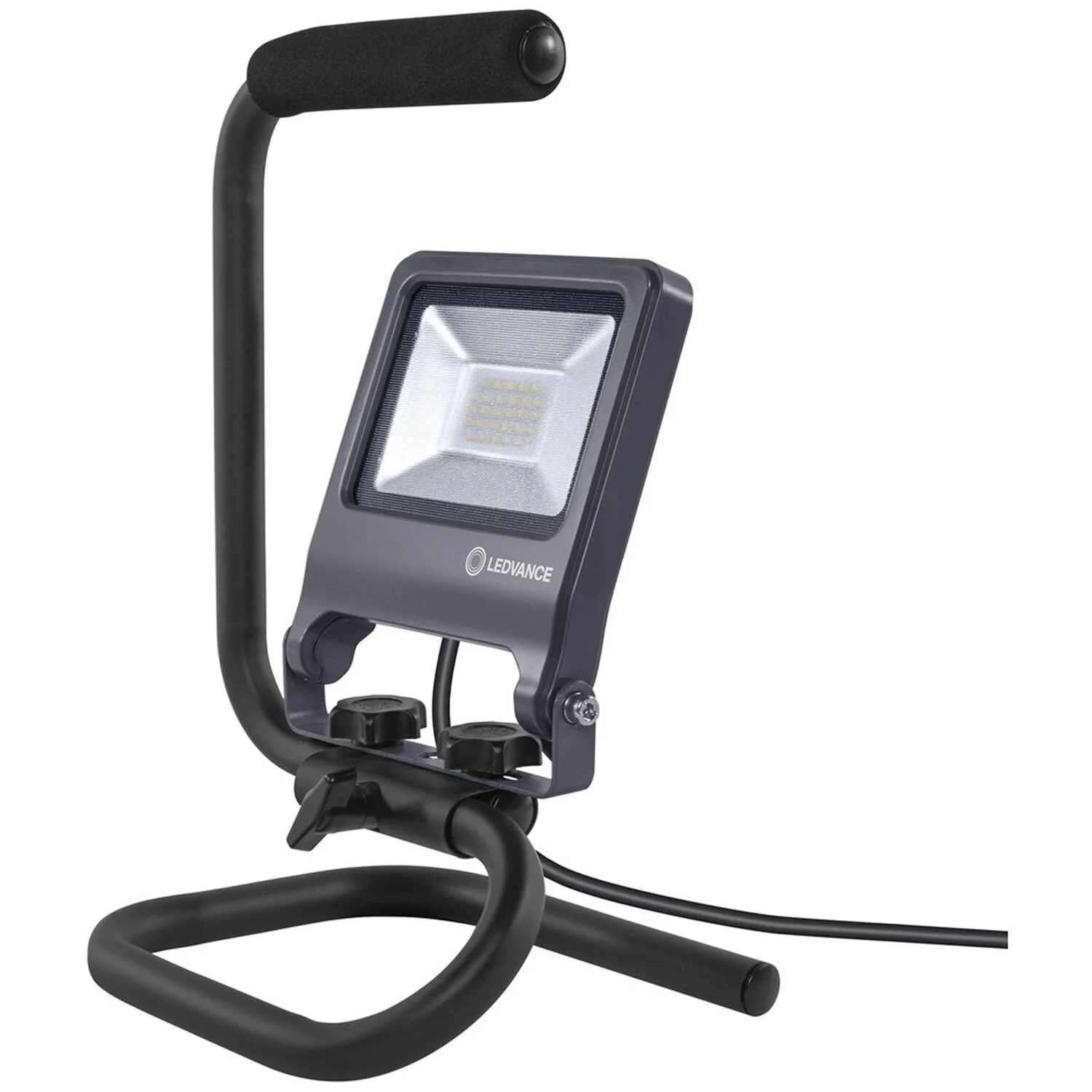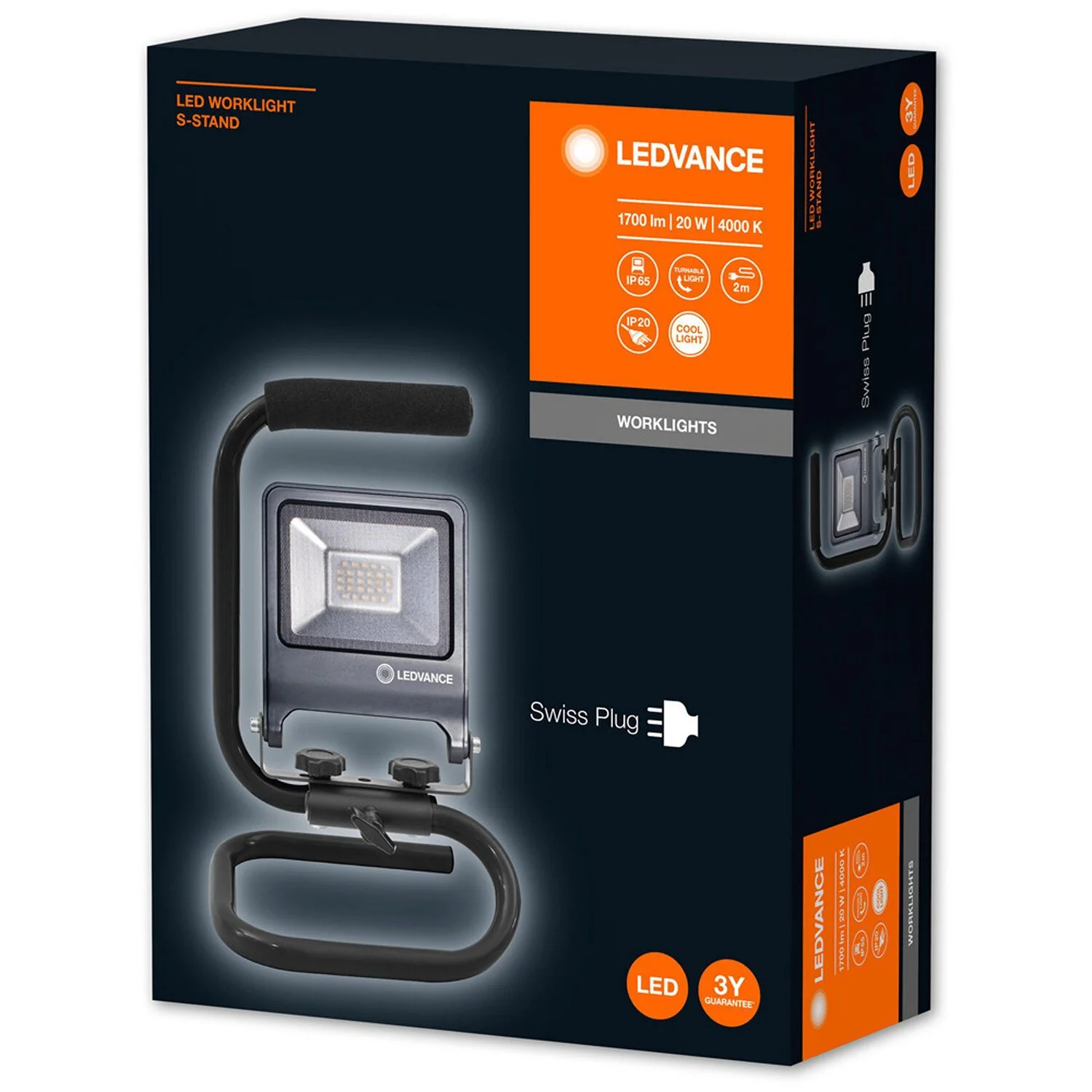 Die Arbeitsleuchte Worklight S-Stand 20 W von Ledvance ist ideal für die Beleuchtung von Garage, Keller und Werkstatt und bei Renovierungsarbeiten geeignet. Die Arbeitsleuchte hat ein kompaktes Design und ist mit einem schwenkbarem Leuchtenkopf und einem 2 m langen Kabel ausgestattet. Die teilmattierte Abdeckung aus gehärtetem Glas sorgt für eine gleichmässige Lichtverteilung. Die Arbeitsleuchte Worklight weist, verglichen mit Halogenlampen-Arbeitsleuchten, eine Energieersparnis von bis zu 80 % auf. Der Leuchtekopf und das Leuchtengehäuse verfügen über die Schutzart IP65, der Stecker über die Schutzart IP44. Die Masse sind (HxBxT) 27,5 x 17,5 x 17 cm.