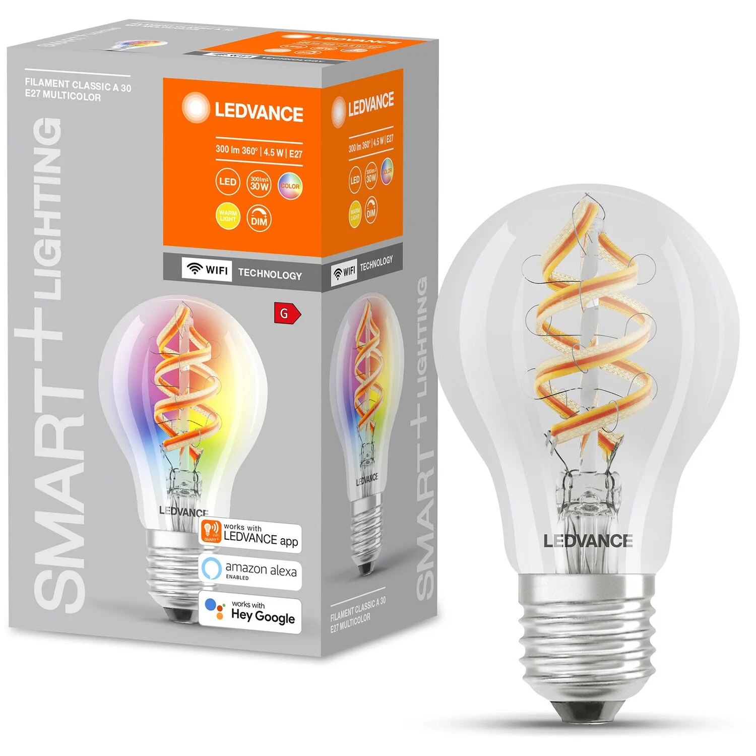 Die smarte Wifi LED-Lampe von Ledvance in klassischer Kolbenform mit Glühwendel-Design ist ein modernes Leuchtmittel mit intelligenter kabelloser Steuerungstechnik.