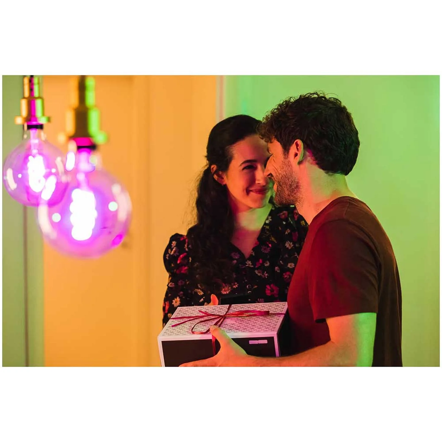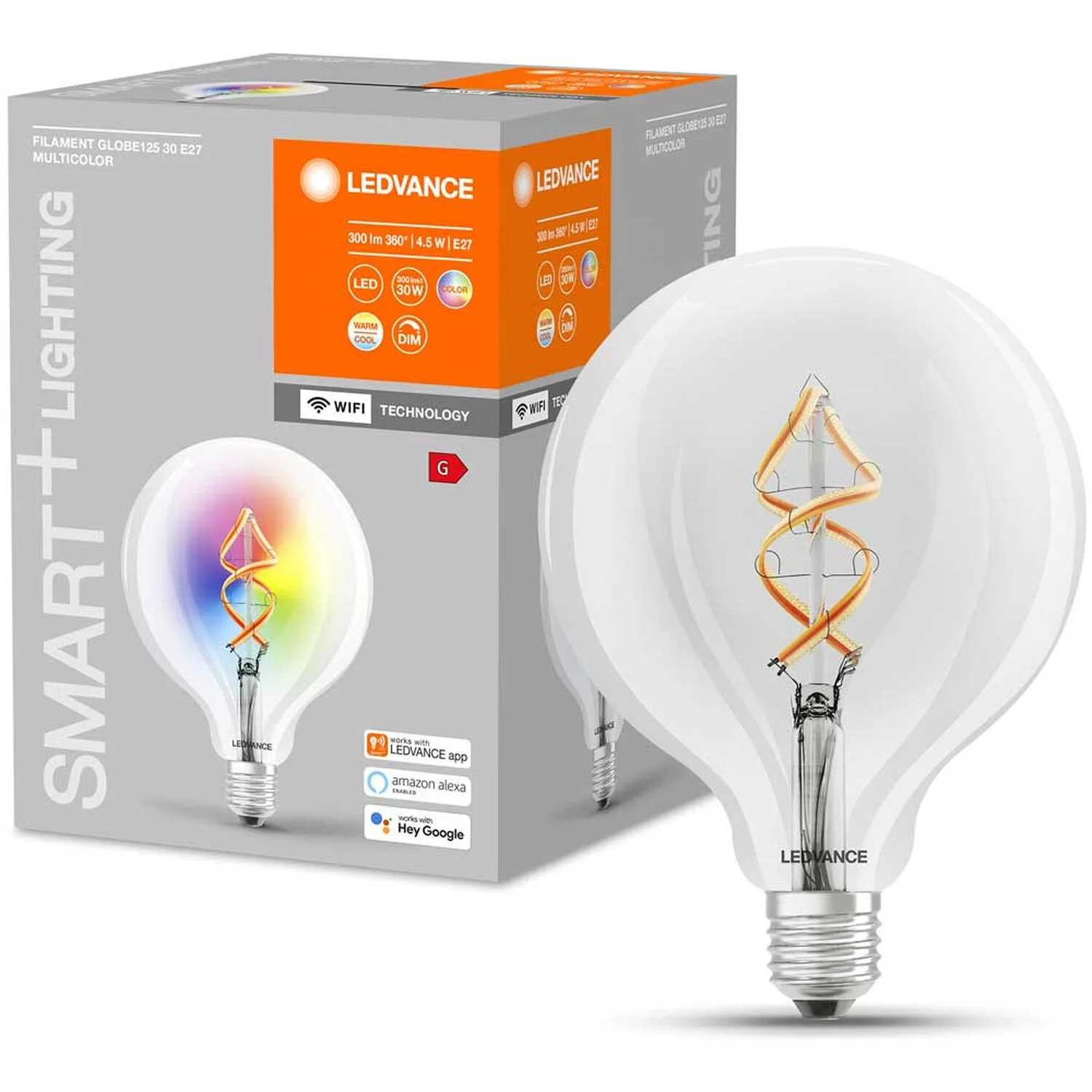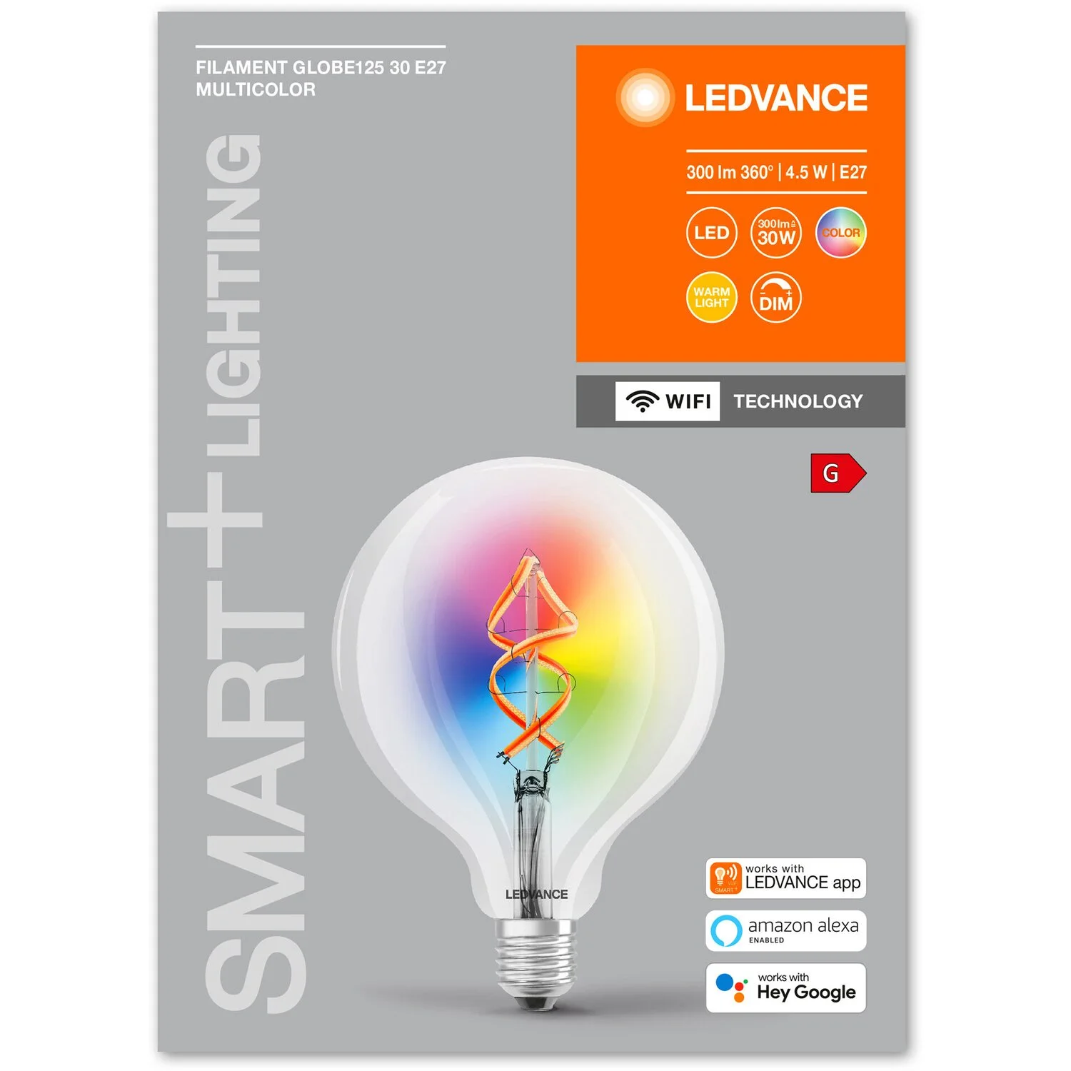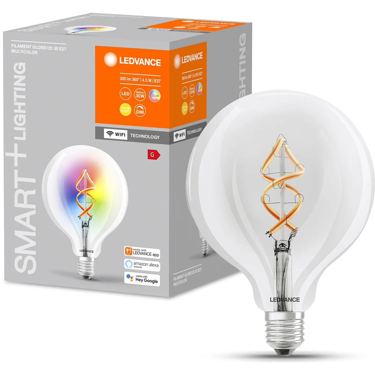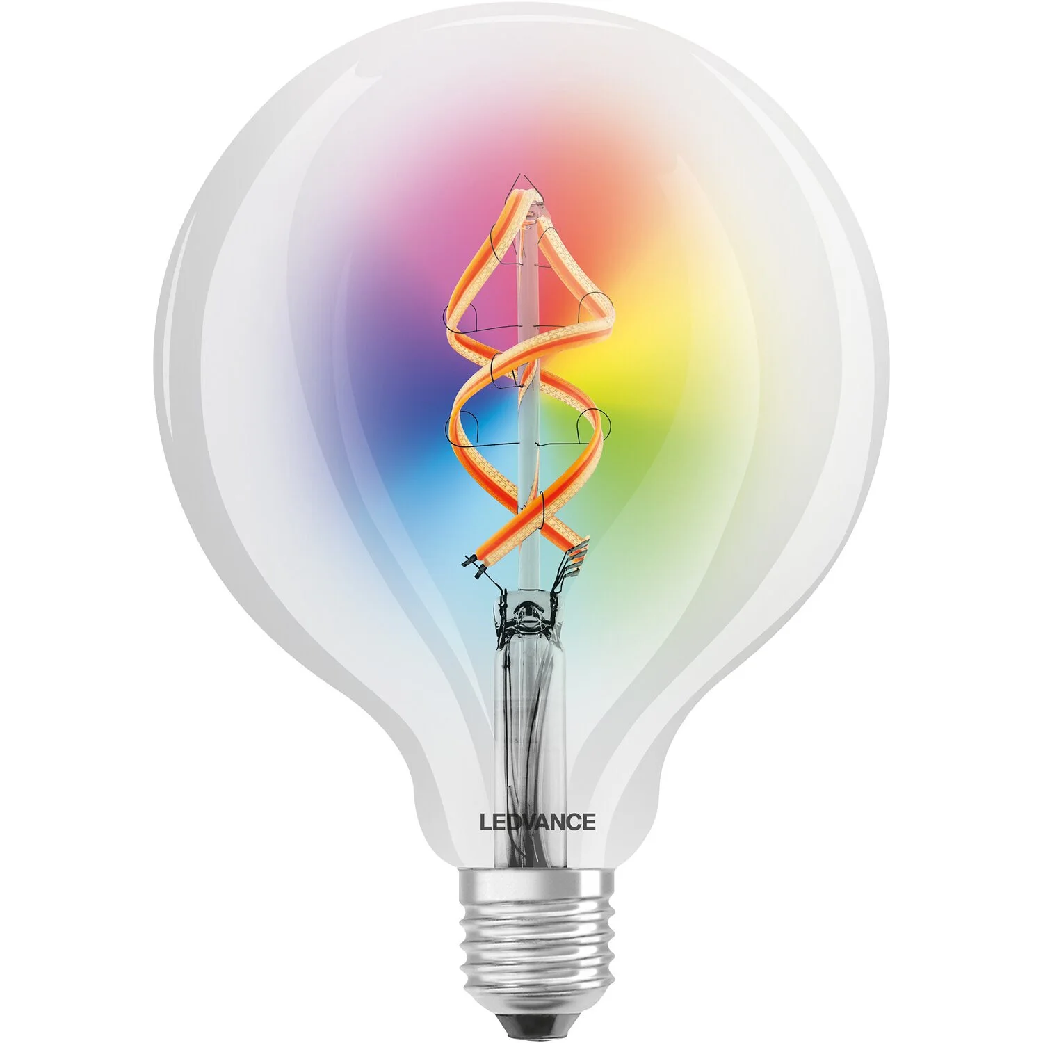 Dieses Ledvance Smart+ Wifi-LED-Leuchtmittel im Glühwendel-Design verfügt über einen RGBW-Farbwechsel sowie eine Dimmfunktion