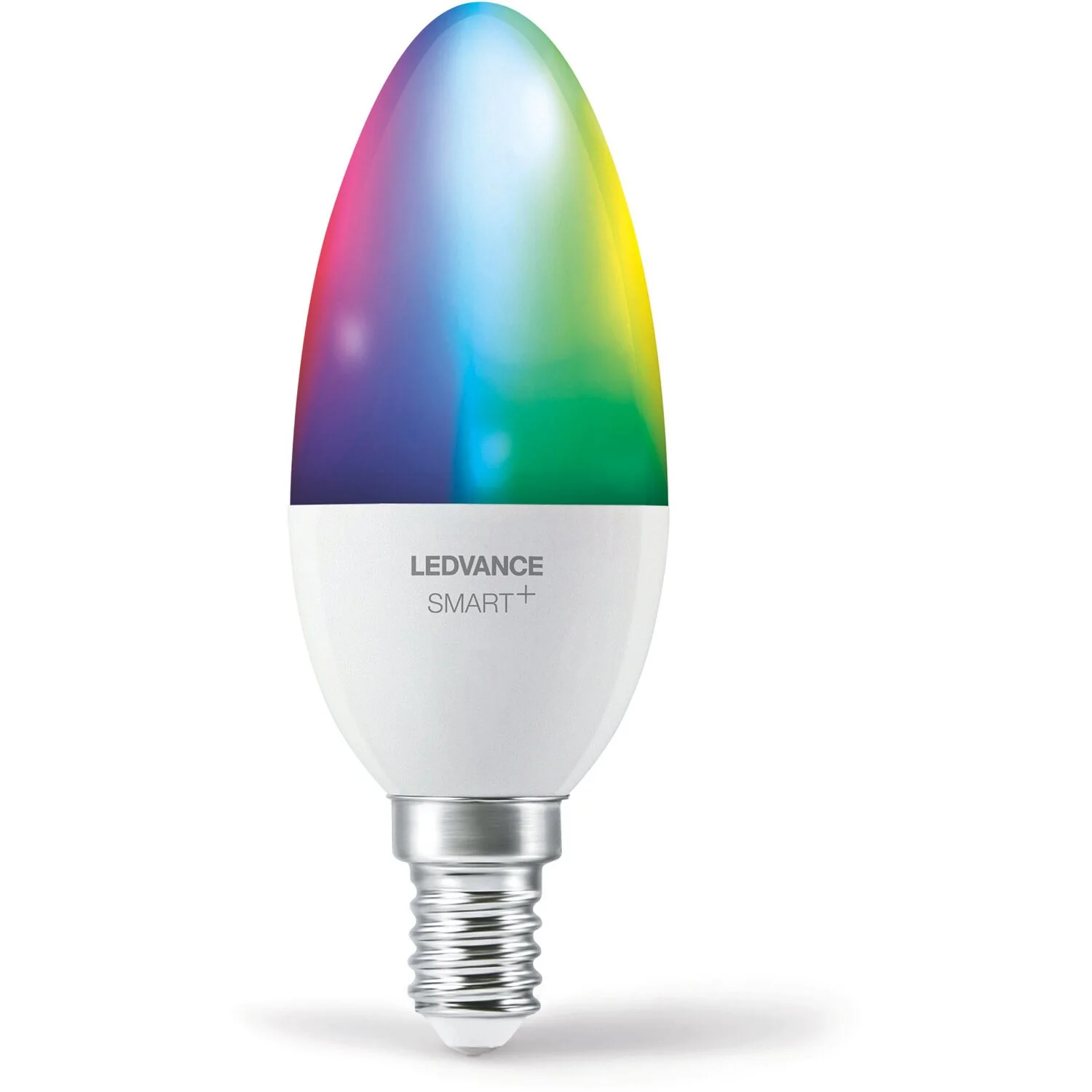 Das Ledvance LED-Leuchtmittel Kerzenform E14 WiFi RGBW / 5 W / 470 lm ist eine smarte WiFi LED-Lampe in klassischer Kerzenform mit intelligenter kabelloser Steuerungstechnik. Dank innovativer LED-Technologie zeichnet sich das Leuchtmittel durch lange Lebensdauer und hohe Energieeffizienz aus. Mit seinem opalfarbenem Glaskolben eignet sich das Leuchtmittel perfekt für die smarte Allgemeinbeleuchtung im Innenbereich.