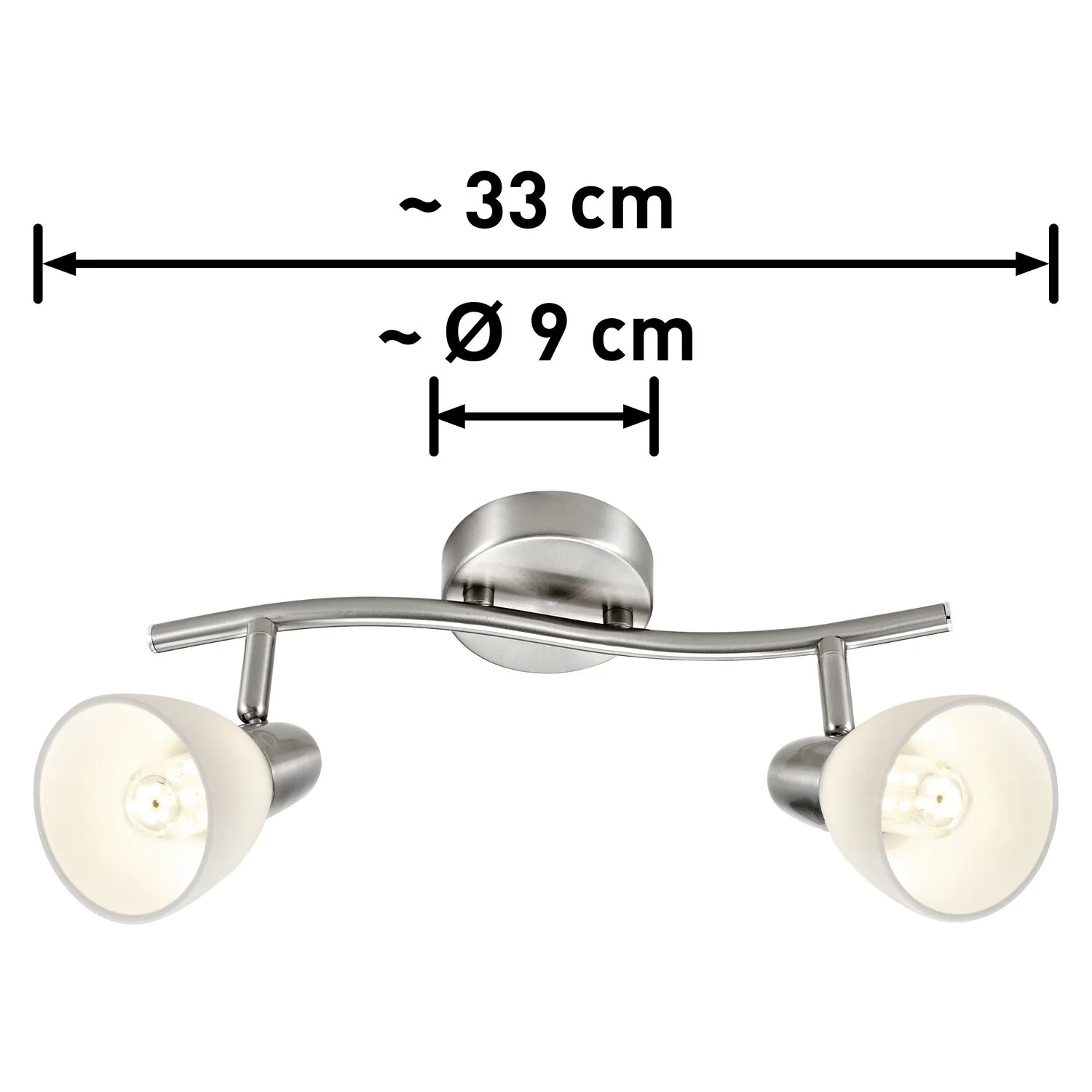 Der OBI Lighting 2er-LED-Spot Matera überzeugt durch sein klassisches, fast schon unauffälliges Design. Der in Nickel matt gehaltene Spot kann mit jeder Wohneinrichtung kombiniert werden. Ob nun im modernen Jugendzimmer, dem elterlichen Schlafzimmer oder dem Wohlfühlort Wohnzimmer, mit dem weissen Dekorglas stehen Ihnen alle Möglichkeiten offen. Mitgeliefert wird Ihnen zwei E14-LED-Leuchtmittel, welche in ihrer Form auf den Spot abgestimmt sind. Natürlich steht es Ihnen frei, eigene E14-Leuchtmittel bis max. 4 W zu wählen und in den Spot zu integrieren.