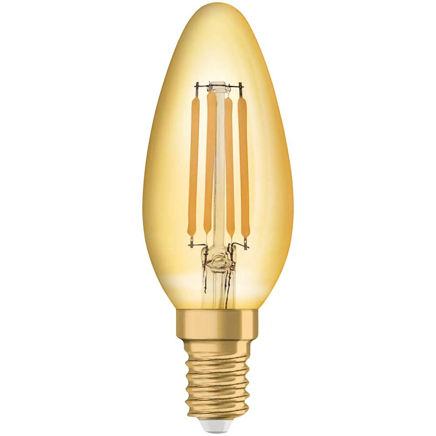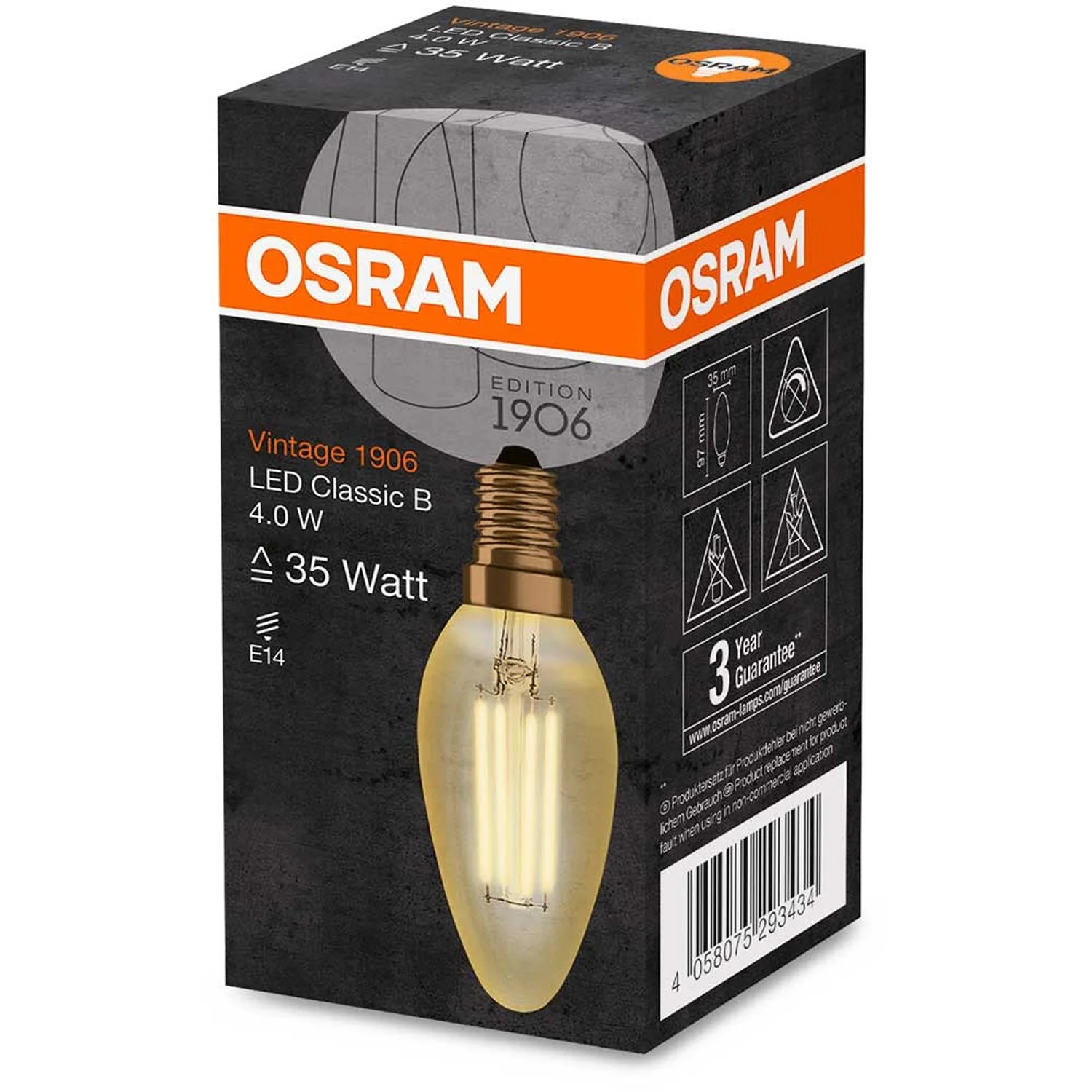 Diese Osram Vintage 1906 LED-Lampe in klassischer Kerzenform ist ein sehr sparsames Retrofit LED Leuchtmittel für E14 Fassungen. Mit Ihrer Energieeffizienzklasse F, einer Schaltfestigkeit von 100’000 Schaltzyklen und einer Durchschnittlichen Lebensdauer von 15’000 Stunden schonen Sie gleichzeitig die Umwelt und Ihren Geldbeutel. Der Lichtstrom von 420 lm und ihr Ausstrahlungswinkel von nahezu 360° entsprechen dabei weitestgehend denen einer herkömmlichen Glühlampe, welche die 8-fache Leistungsaufnahme erfordern würde. Der goldgetönte Glaskolben ermöglicht freien Blick auf das inliegende Filament, so dass sich diese Lampe ideal für dekorative Einbauten im Innenbereich (IP20) anbietet.