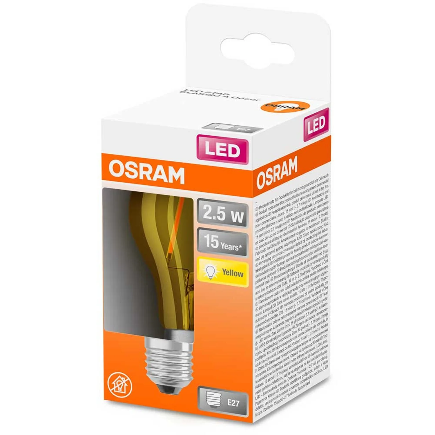 Das Osram LED-Leuchtmittel Classic A E27 Glühlampenform matt Gelb 2,5 W / 235 lm ist eine farbige LED-Lampe in klassischer Kolbenform mit Schraubsockel.