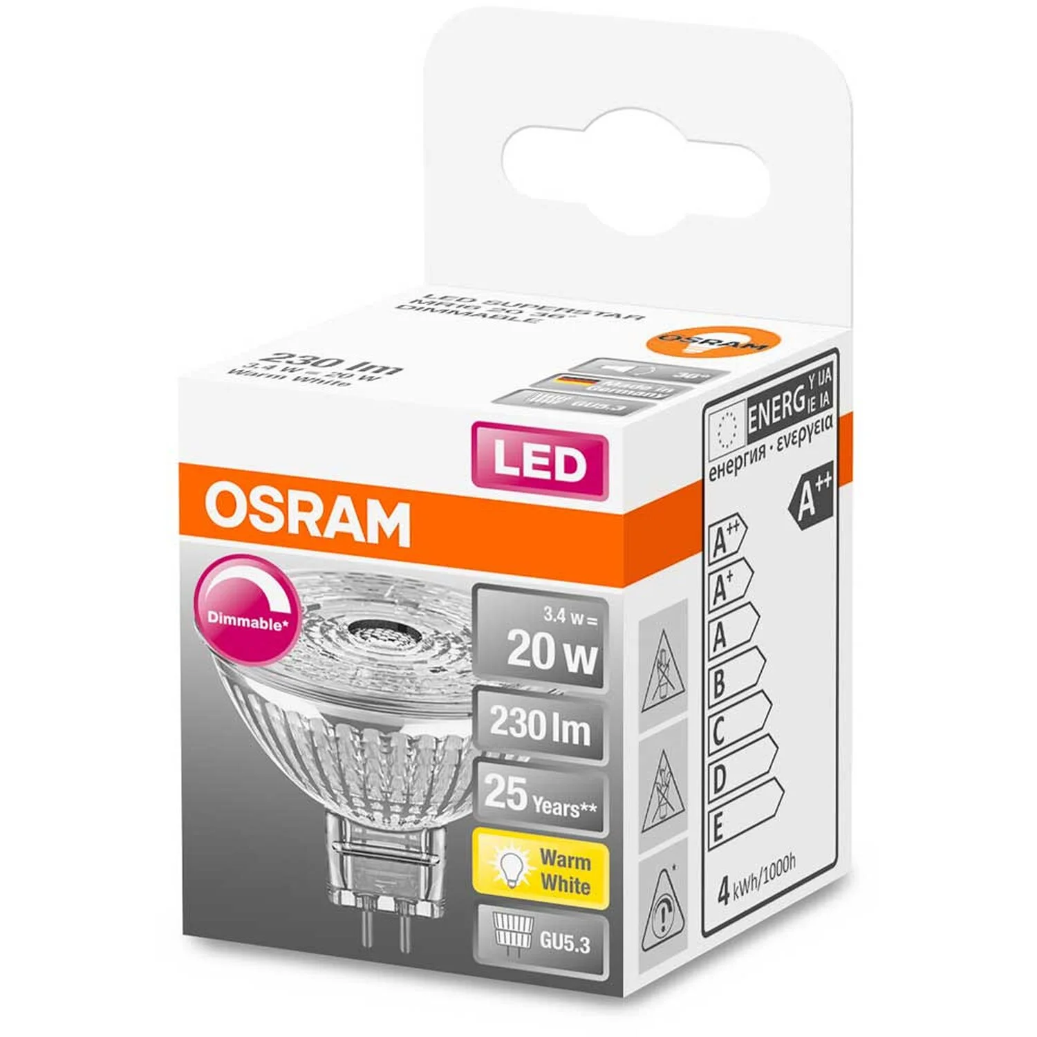 Das dimmbare Osram LED-Leuchtmittel GU5.3 Reflektor MR16 klar 3,4 W / 230 lm mit Retrofit-Stecksockel GU5.3 ist die LED-Alternative zu konventionellen Niedervoltlampen.