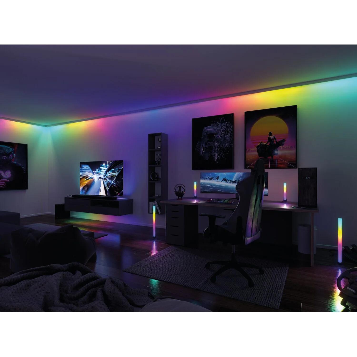 Das Paulmann EntertainLED Dynamic LED-Strip ist ein Komplett-Set, bestehend aus einem 1,5 m langen Stripe, Power Supply und eine Infrarot-Fernbedienung. Es schafft ein besonderes Ambiente im Home-Entertainment und im Gaming-Bereich. Mit seinem angenehm, ruhig wechselnden, dynamischen Farbspiel lassen sich effektvolle Lichtakzente setzen. Die komfortable Steuerung per Infrarot-Fernbedienung ermöglicht eine kinderleichte Konfiguration von unzähligen eigenen Farbverläufen und Geschwindigkeiten. Die sehr kleinen Komponenten können ohne Werkzeug Plug and Play verbunden werden und mit dem beiliegenden Netzteil sofort in Betrieb genommen werden.