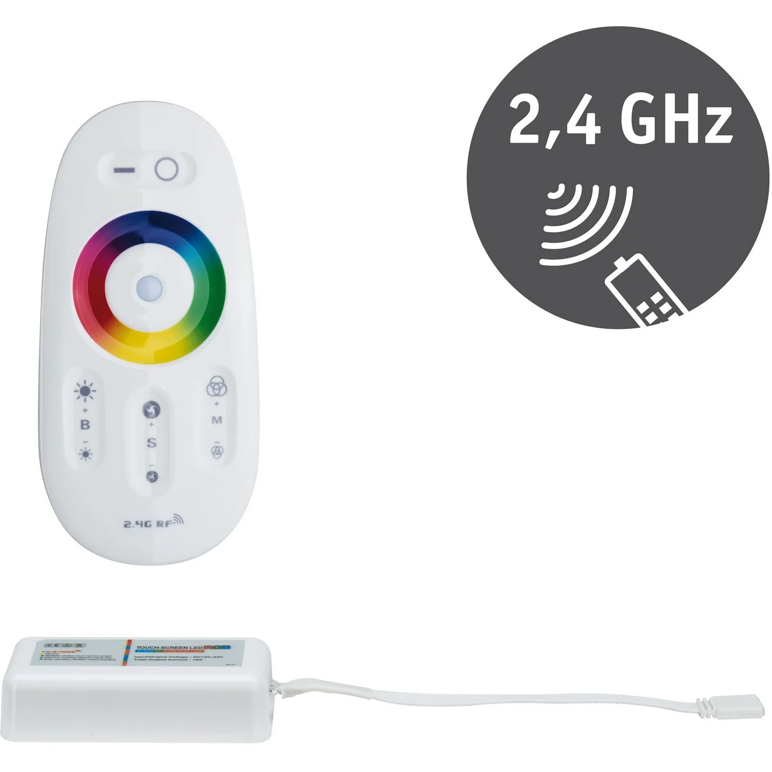 Mit dem MaxLED-RGBW-Controller und der mitgelieferten Funkfernbedienung lassen sich mehrfarbige MaxLED-RGBW-Strips schalten und dimmen sowie Lichteffekte steuern. Dazu ist kein sichtbarer Kontakt zwischen der Fernbedienung und dem Empfänger erforderlich.