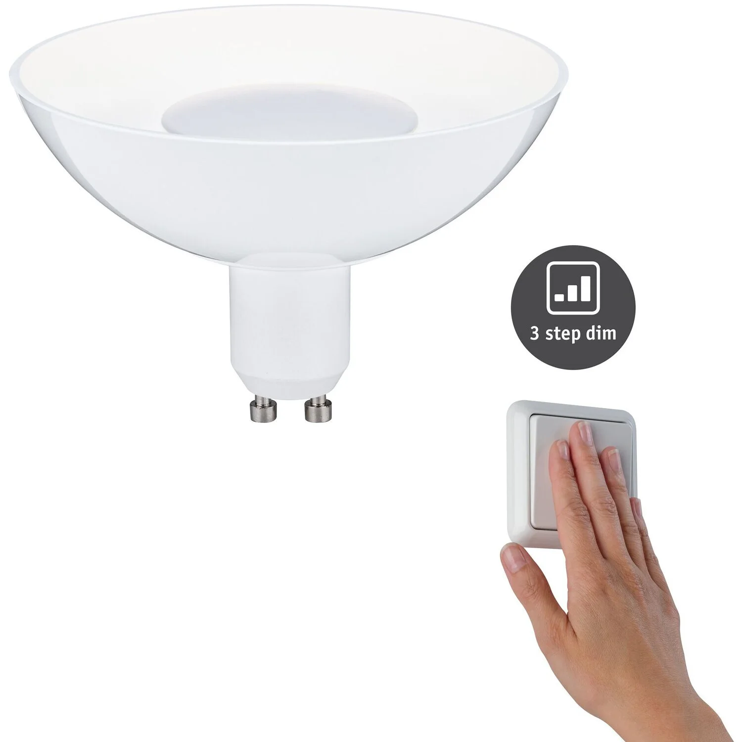 Diese LED-Reflektorlampe ist der ideale Ersatz für alte Halogenreflektoren. Durch die Innenverspiegelung werden die Lichtstrahlen gebündelt und die Lampe sorgt für fokussiertes Licht, welches gezielt in eine Richtung gelenkt wird. Dank seiner Optik kann das Leuchtmittel dekorativ in Spotlights eingesetzt werden. Die integrierter 3-Step-Dimm-Funktion ermöglicht durch mehrmaliges Betätigen eines handelsüblichen Lichtschalters eine dreistufige Dimmbarkeit.
