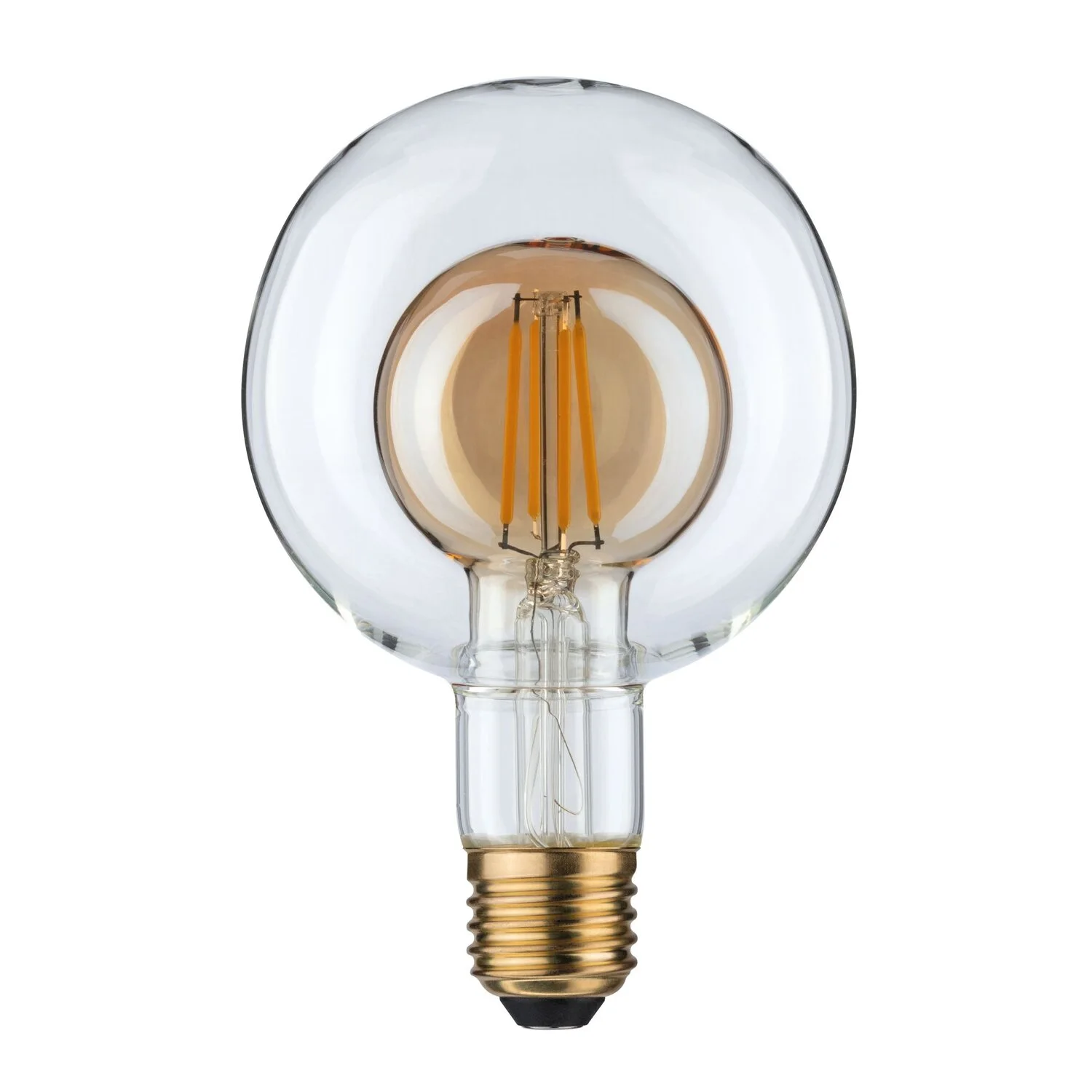 Die G95-Globenlampe in der Farbe Gold macht jede Leuchte zum besonderen Hingucker. Das innere Dekorglas wird von einer Globe aus klarglas umhüllt. Die Lampe hat eine angenehm warmweisse Lichtfarbe und eignet sich für jede E27-Fassung.