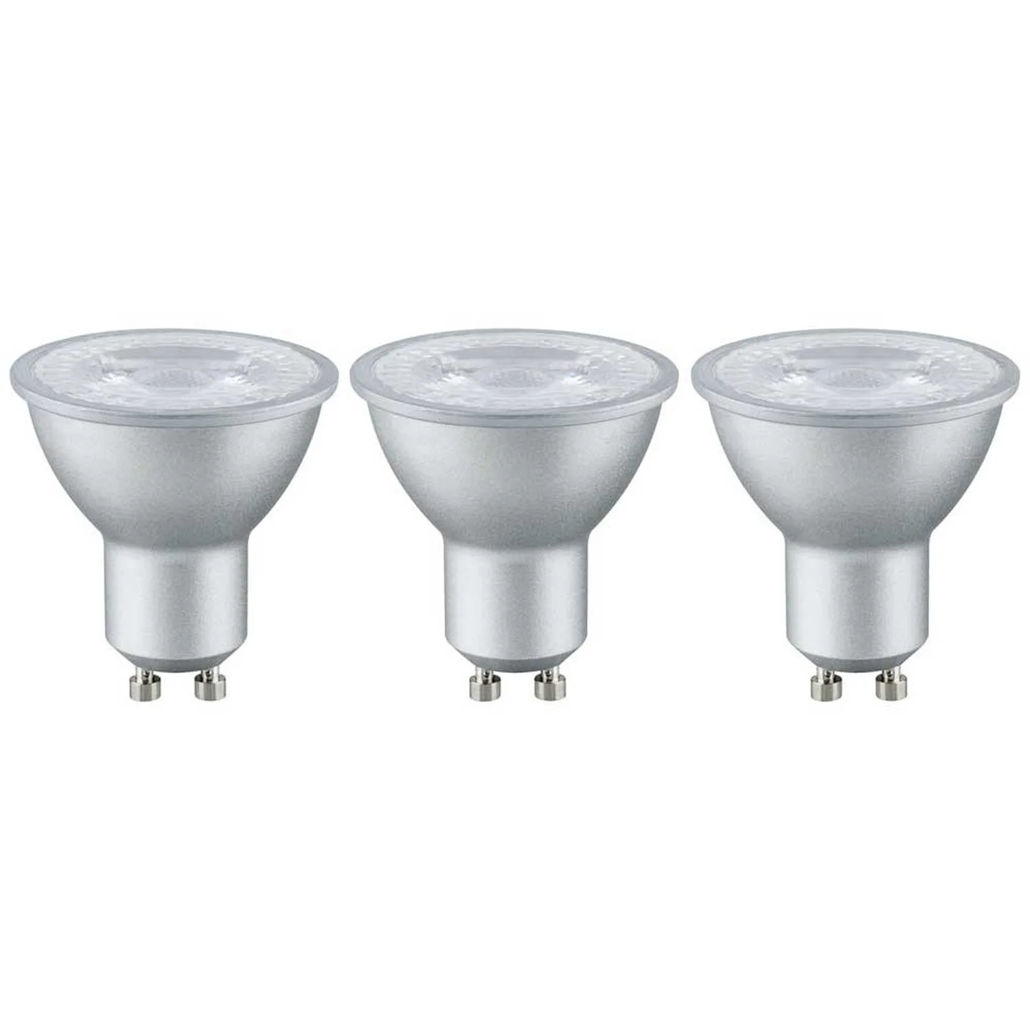 Reflektorlampen sorgen für gerichtetes Licht in Strahlern, Spots und Downlights. Der Lichtkegel setzt Deko und Einrichtungsgegenstände gezielt in Szene. Dieses Paulmann 3er-Set Leuchtmittel strahlt eine angenehm warmweisse Lichtfarbe aus und die Leuchtmittel passen in jede handelsübliche GU10-Fassung.