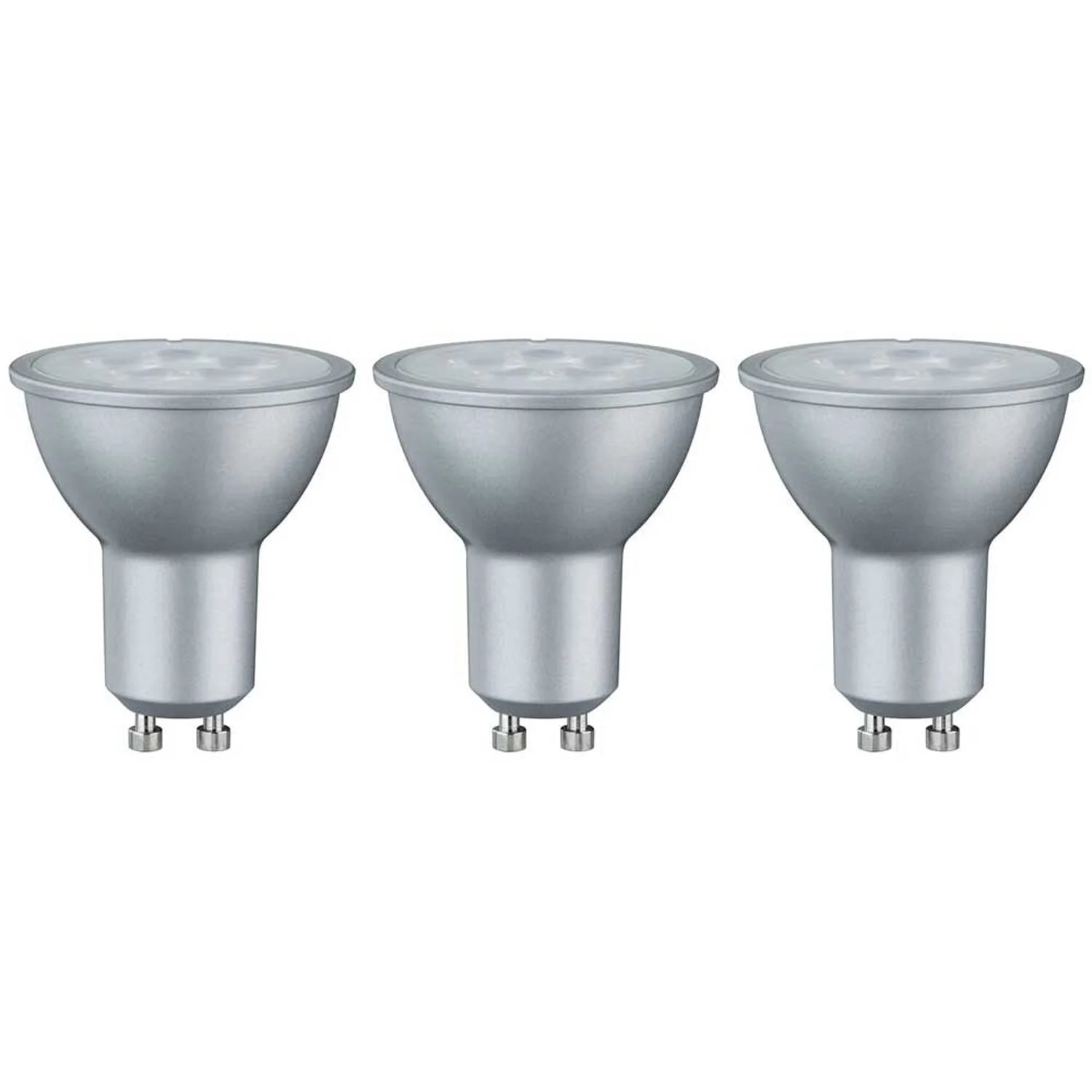 Reflektorlampen sorgen für gerichtetes Licht in Strahlern, Spots und Downlights. Der Lichtkegel setzt Deko und Einrichtungsgegenstände gezielt in Szene. Dieses Paulmann 3er-Set Leuchtmittel strahlt eine angenehm warmweisse Lichtfarbe aus und die Leuchtmittel passen in jede handelsübliche GU10-Fassung.