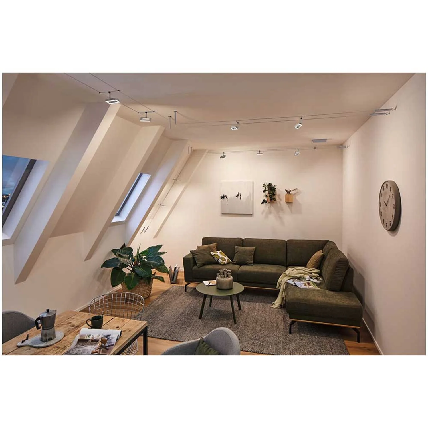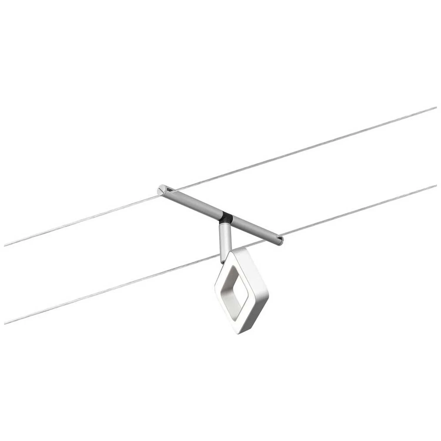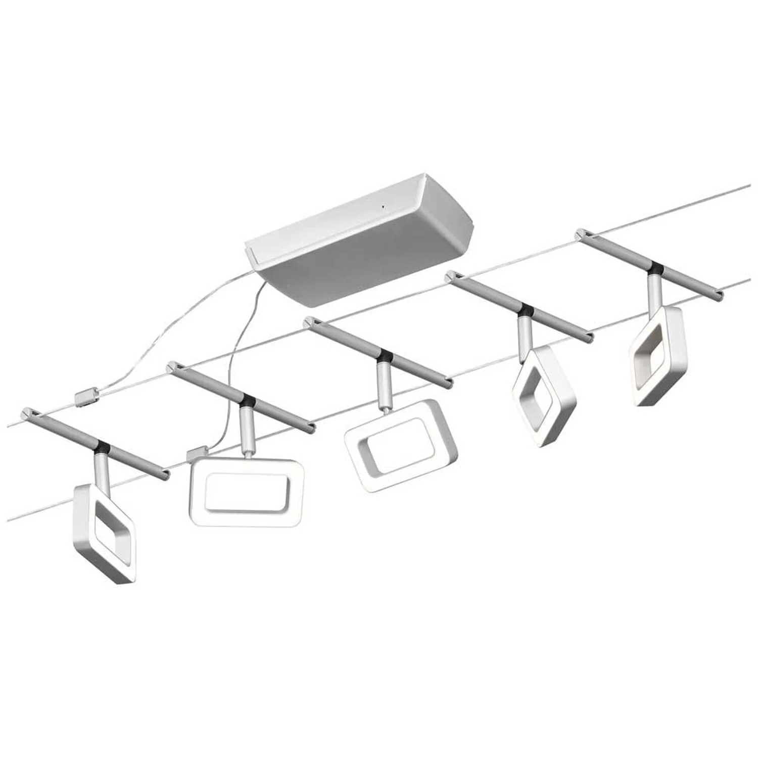 Das LED-Seilspot-Set Frame verfügt über fünf Spots inklusive LED-Leuchtmittel. Es kann sowohl an der Wand als auch an der Decke montiert werden und bietet dadurch grenzenlose Gestaltungsmöglichkeiten. Egal, ob gerade, schräg oder verwinkelt – Seilsysteme passen in jeden Raum und sind die Problemlöser für schwierige Installationsbedingungen. Das Basis-Set lässt sich individuell durch Einzelspots, Umlenker und weiteres Zubehör ergänzen. Das Seil mit einer Länge von 10 m kann in der Mitte geteilt werden, sodass das System auf maximal 5 m gespannt werden kann. Mit diesem System lässt sich eine optimale Lichtverteilung realisieren, bei steigendem Lichtbedarf lässt es sich problemlos erweitern. Für die Verteilung der Leuchten im gesamten Raum wird nur ein Stromauslass benötigt.