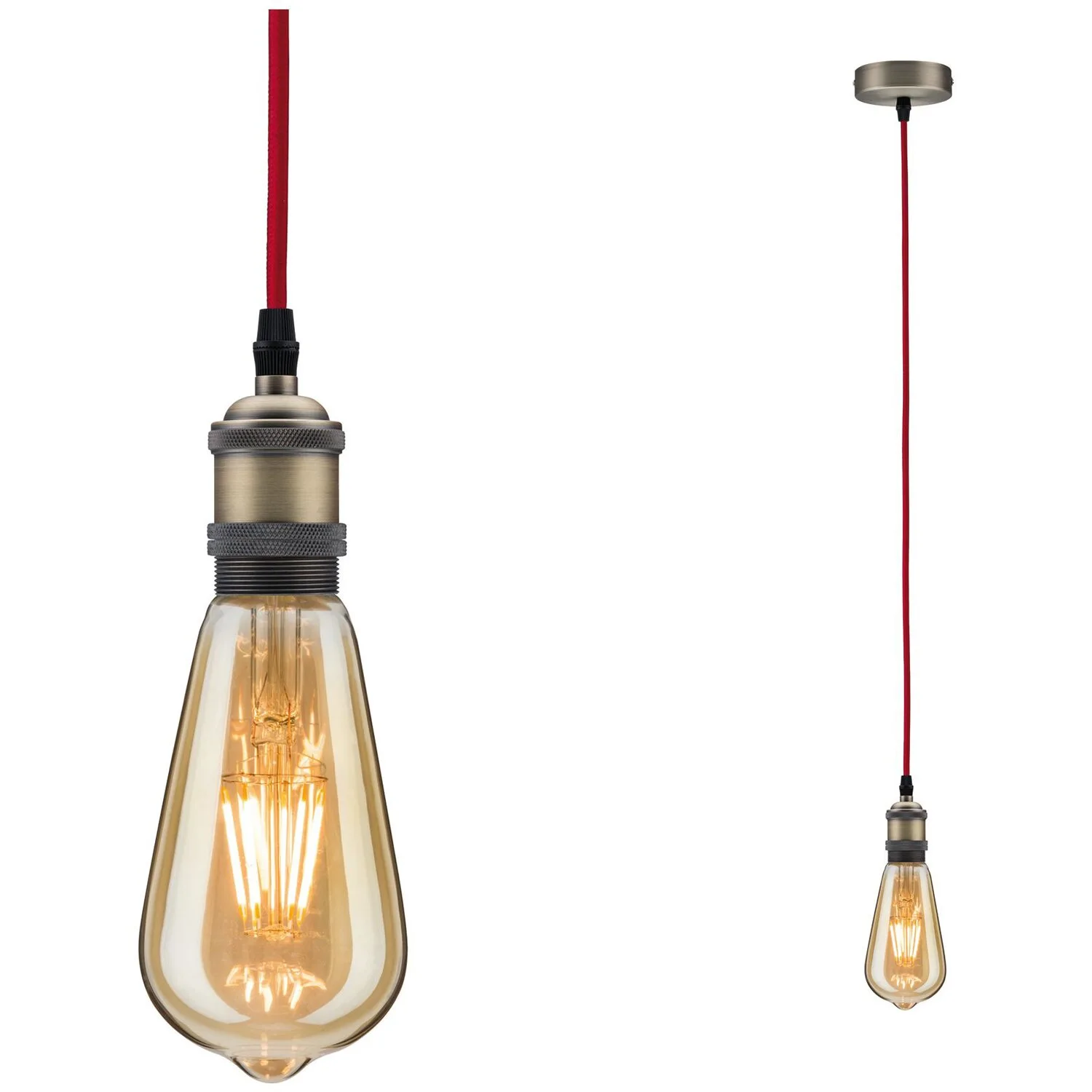Die Pendellampe Eldar steht für stylisches Licht im Retrolook. Der Mix aus roten Stoffkabel und brünierter Fassung macht das Pendel zum dekorativen Hingucker.