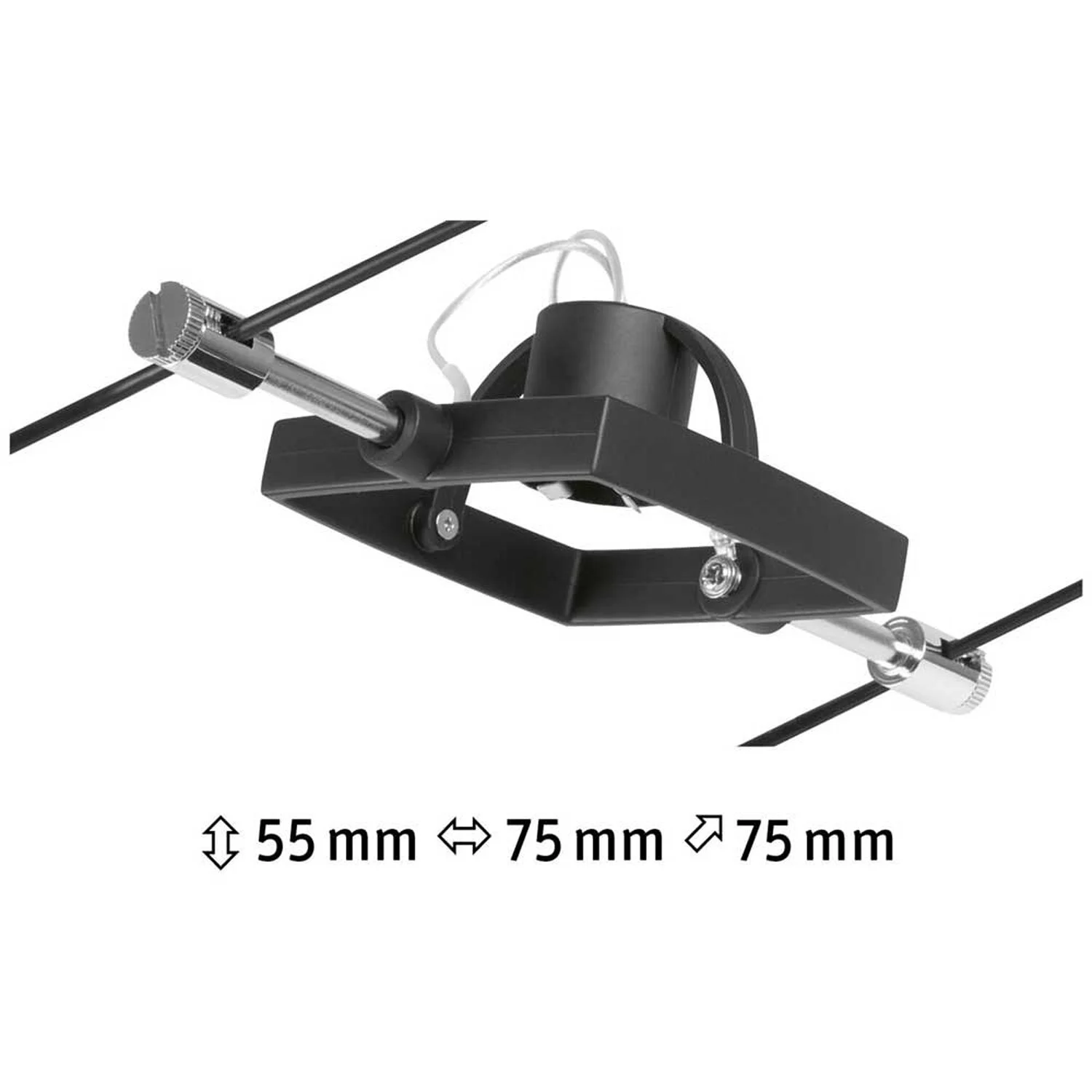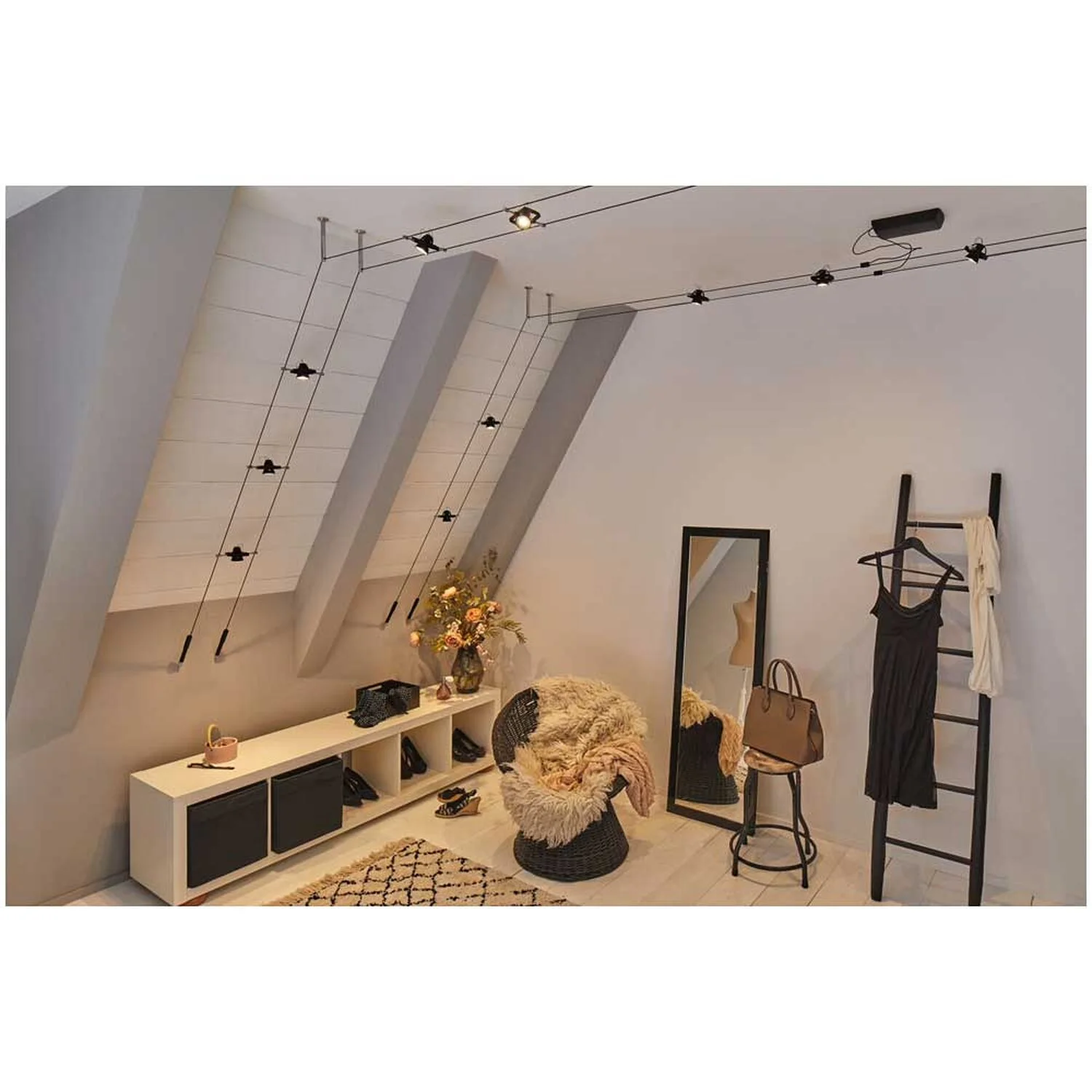 Der Einzelspot Mac II in eignet sich besonders zur Ergänzung eines bestehenden Seilsystems. Seilsysteme können sowohl an der Wand als auch an der Decke montiert werden und bieten dadurch grenzenlose Gestaltungsmöglichkeiten. Egal, ob gerade, schräg oder verwinkelt – Seilsysteme passen in jeden Raum und sind die Problemlöser für schwierige Installationsbedingungen. Für die Verteilung der Leuchten im gesamten Raum wird nur ein Stromauslass benötigt.