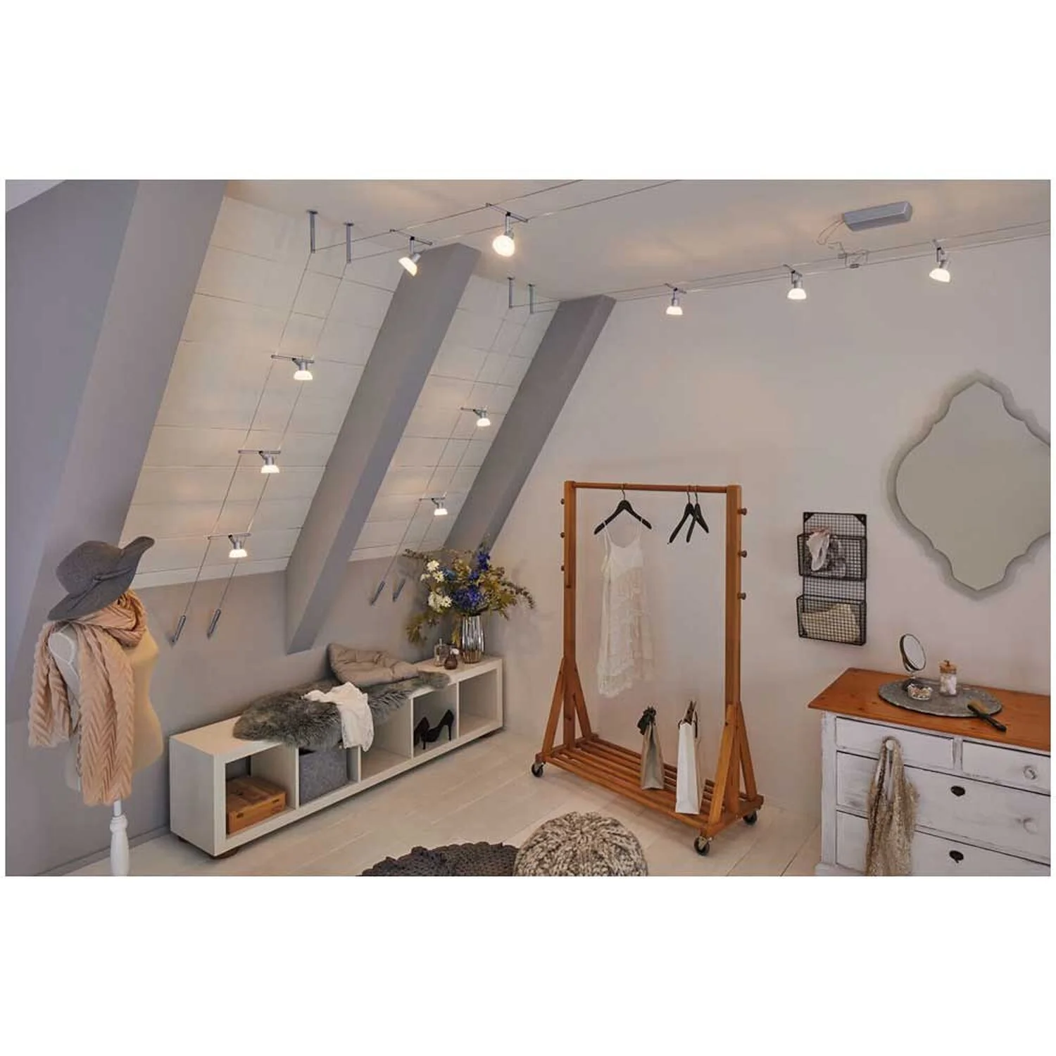 Der Einzelspot Sheela eignet sich besonders zur Ergänzung eines bestehenden Seilsystems. Seilsysteme können sowohl an der Wand als auch an der Decke montiert werden und bieten dadurch grenzenlose Gestaltungsmöglichkeiten. Egal, ob gerade, schräg oder verwinkelt – Seilsysteme passen in jeden Raum und sind die Problemlöser für schwierige Installationsbedingungen. Für die Verteilung der Leuchten im gesamten Raum wird nur ein Stromauslass benötigt.