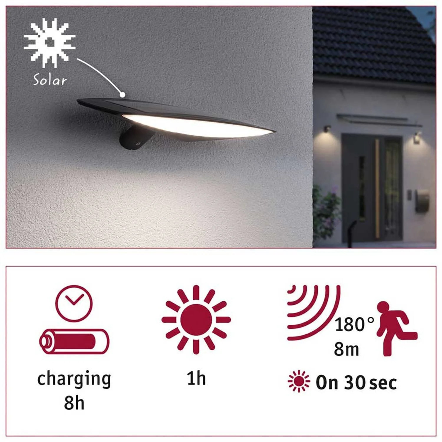 Die Solar-Aussenwandleuchte Kiran beleuchtet Ihren Aussenbereich. Dank praktischer Solartechnik ist ein Stromanschluss für die Montage nicht notwendig. Der austauschbare Lithium-Ionen-Akku wird tagsüber durch Sonnenlicht aufgeladen und der Bewegungsmelder sorgt dafür, dass das Licht bei Dunkelheit automatisch angeht, sobald sich jemand annähert. Die Leuchte ist durch ihren IP44-Schutz speziell gegen das Eindringen von Feuchtigkeit und Staub geschützt.