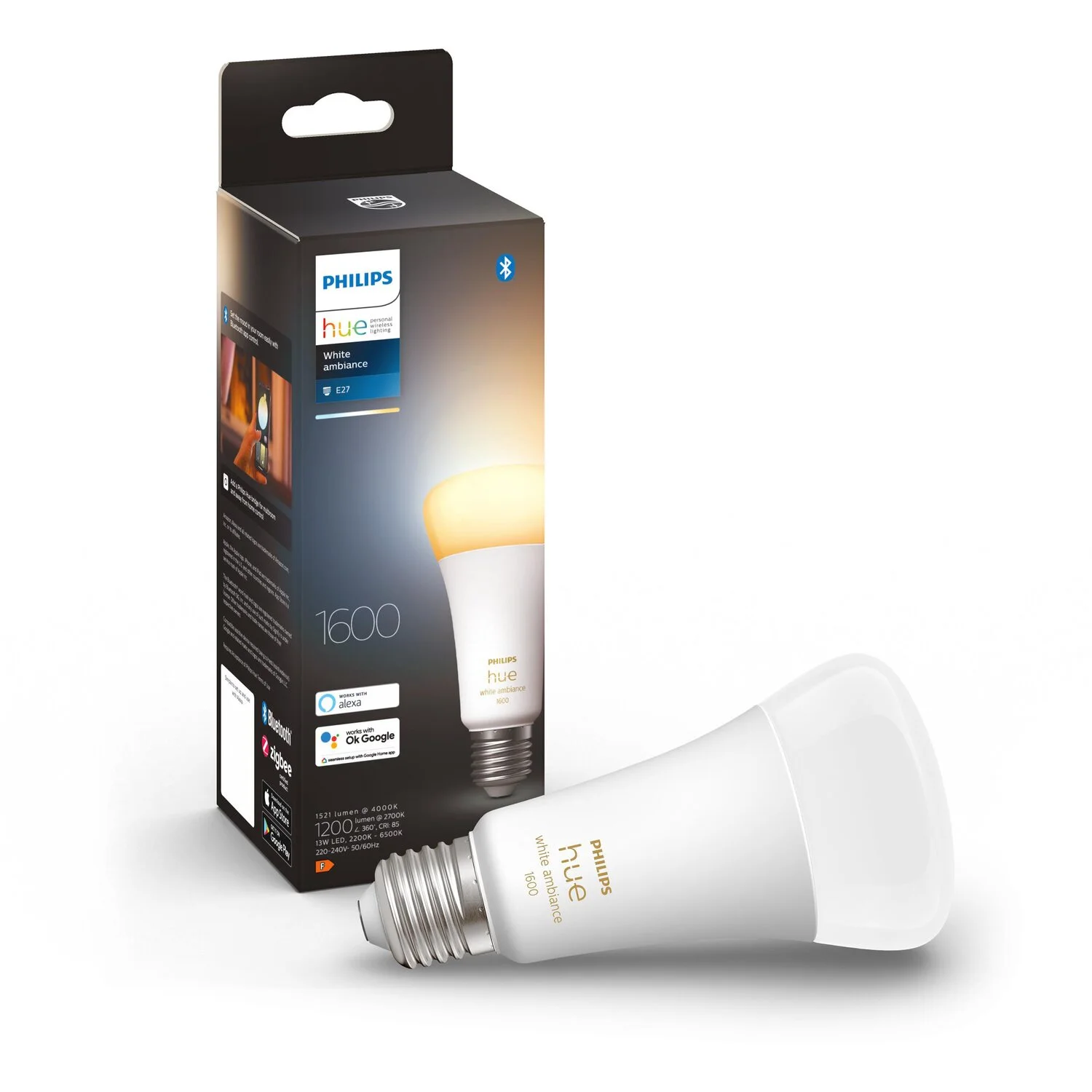 Das Philips Hue White Ambiance Leuchtmittel mit E27-Sockel verfügt über eine Leistung von 13 W und spendet ein 1’100 lm helles Licht. Die Farbtemperatur kann von Warm- bis Kaltweiss angepasst werden. Die sofortige Steuerung ist per Bluetooth, mit App oder über Sprache (mit den erforderlichen Geräten) möglich.