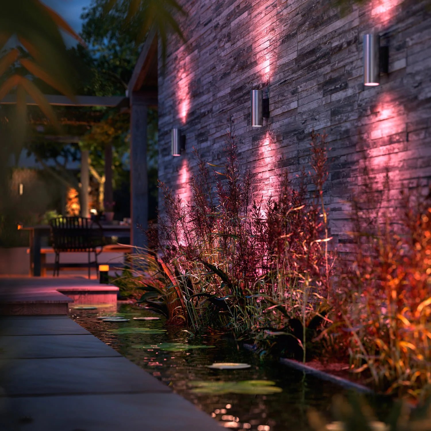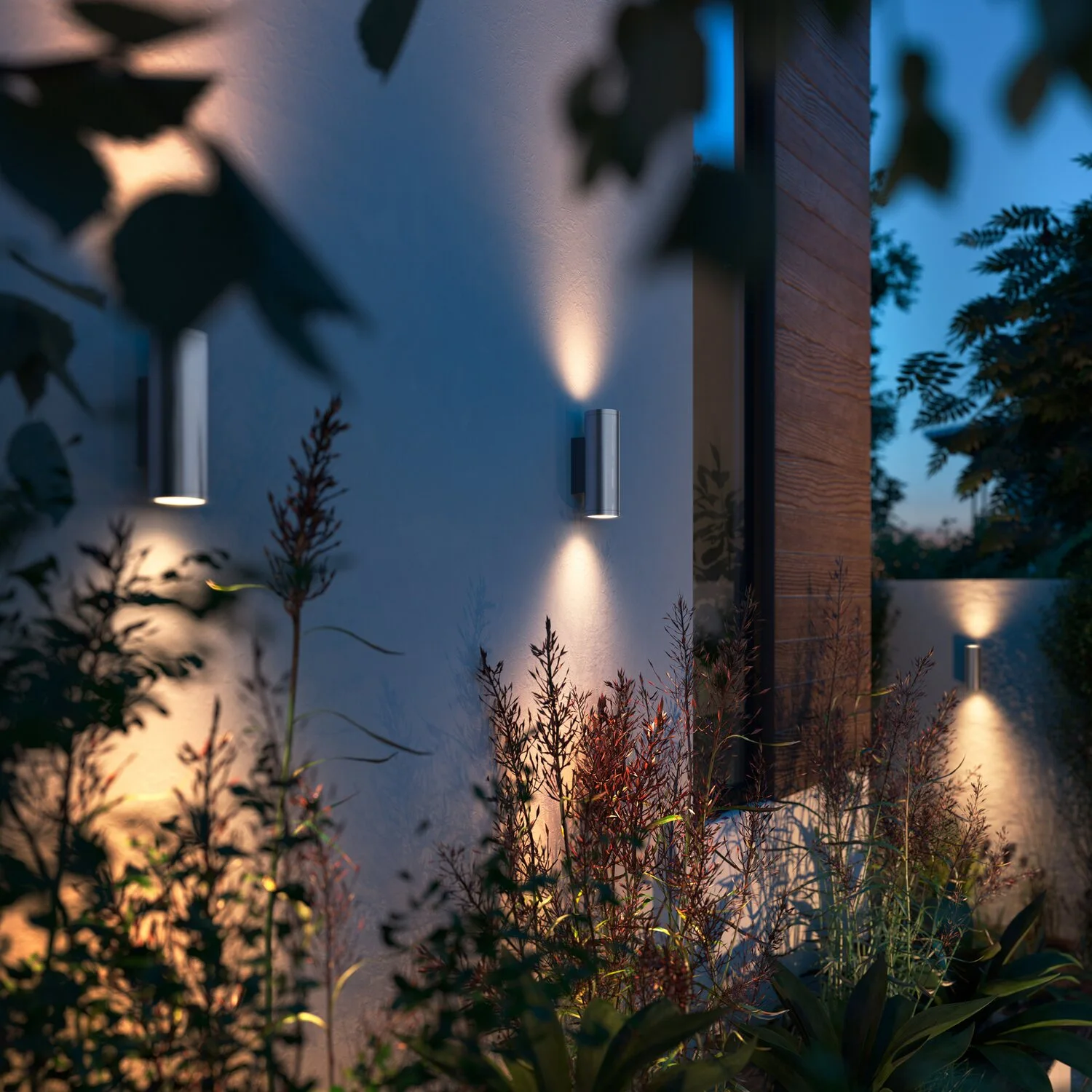 Die Farbtemperatur der Aussenwandbeleuchtung kann zwischen 2’000 K und 6’500 K und somit Warm- oder Kaltweiss eingestellt werden. Aber auch die Lichtfarbe lässt sich mithilfe der Philips Hue App aus 16 Millionen Farben auswählen. Dazu benötigen Sie eine Hue Bridge (separat erhältlich). Wenn Sie bereits über ein Philips Hue System verfügen, lässt sich die Aussenwandleuchte einfach in das bestehende Umfeld integrieren.