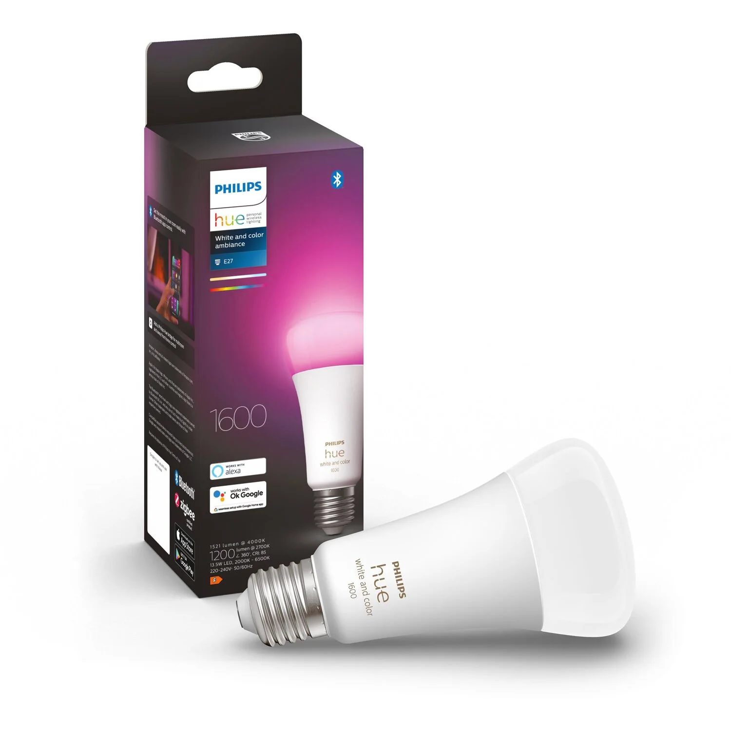 Das Philips Hue White & Color Ambiance Leuchtmittel mit E27-Sockel verfügt über eine Leistung von 13,5 W und spendet 1’100 lm helles Licht. Die Steuerung ist über Bluetooth und die Hue Bridge möglich. Mit der Lampe können Sie 16 Millionen Farben sowie alle Weisstöne erzeugen. Sie ist passend für jede Leuchte mit E27-Fassung.