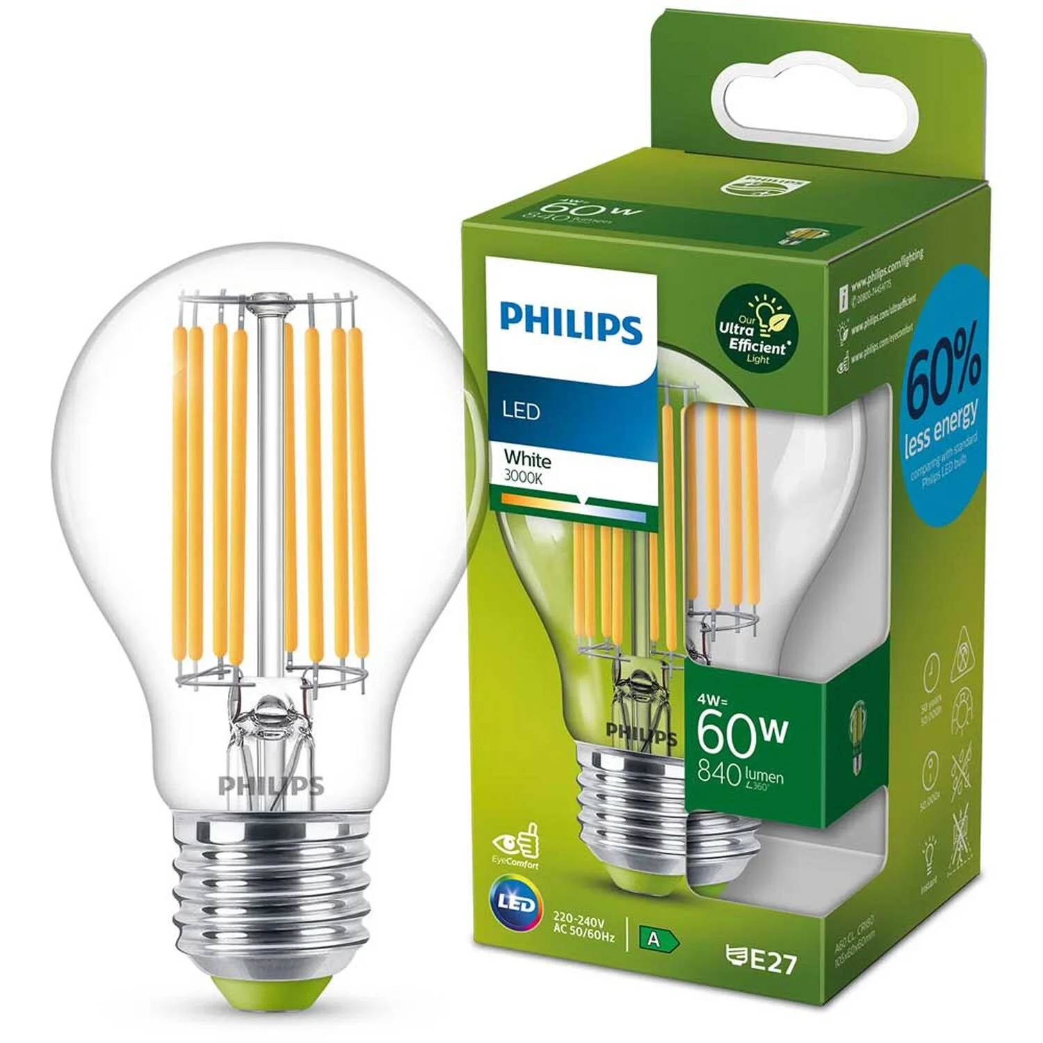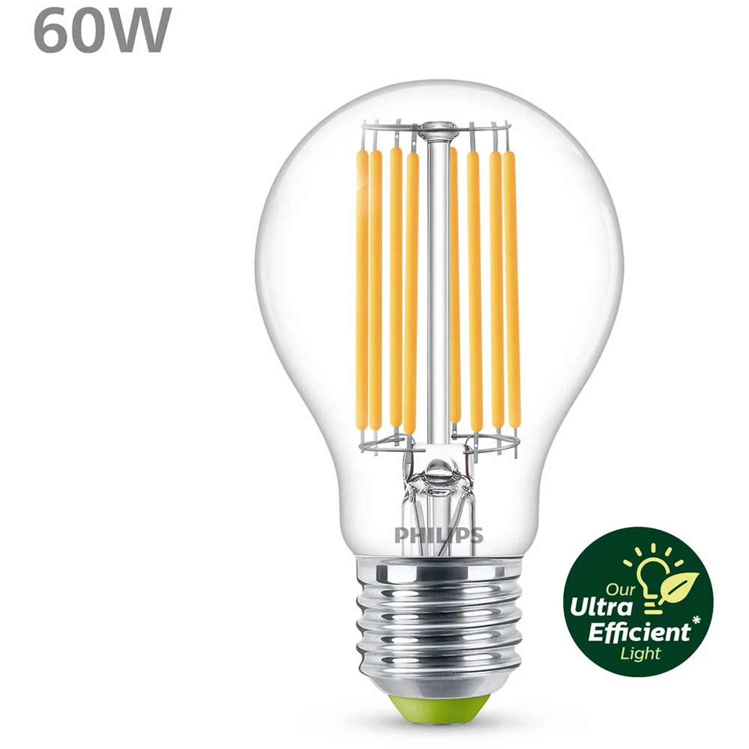 Diese ultraeffiziente LED von Philips bietet ein schönes, warmweisses Licht, eine aussergewöhnlich lange Lebensdauer und dank Energieeffizienzklasse A eine unmittelbare, deutliche Energieeinsparung. Mit seinem eleganten Design ist dieses Leuchtmittel der perfekte Ersatz für klare Glühlampen. Es entspricht einer Glühlampe mit 60 W.