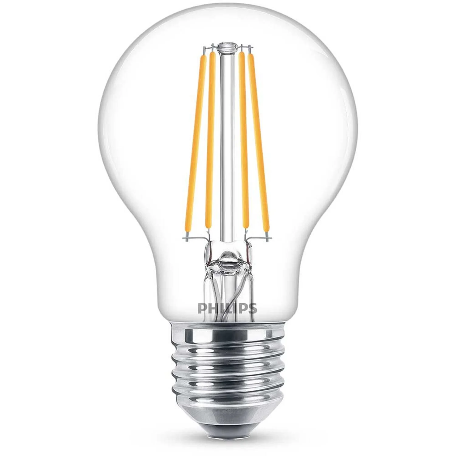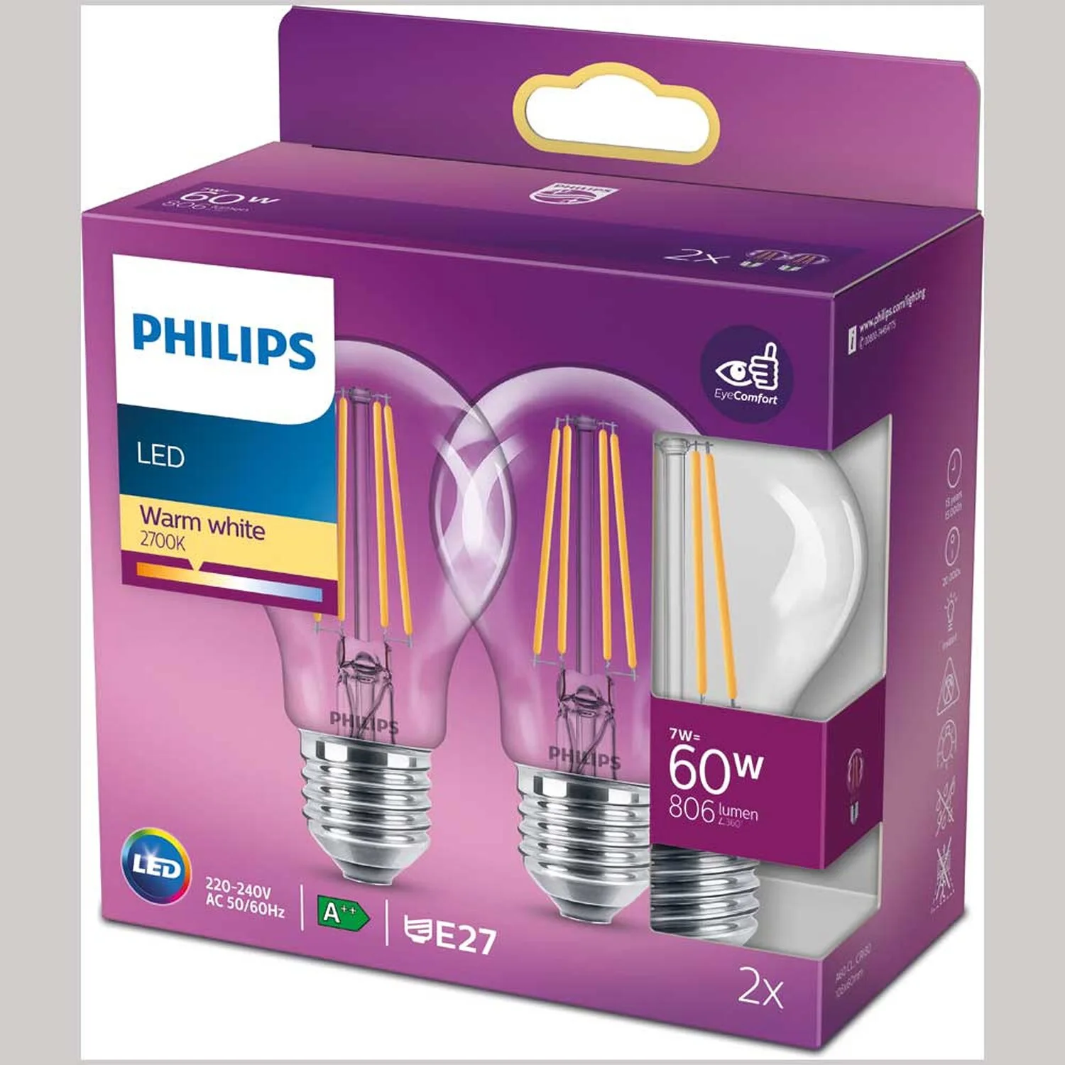 Das Philips LED-Leuchtmittel E27 Standardform klar im 2er-Set ist dank seinem hochwertigen Glasdesign mit sichtbarem LED-Leuchtfaden ideal für Leuchten mit sichtbarem Leuchtmittel geeignet. Es bietet sofort warmweisses Licht (2’700 K) wie bei herkömmlichen Glühlampen und schafft so die vertraute Atmosphäre, die Sie sich für Ihren Wohnraum wünschen. Somit ist dieses energiesparende LED-Leuchtmittel der perfekte nachhaltige Ersatz für herkömmliche Glühlampen. Das Philips LED classic Leuchtmittel hat einen bis zu 85% geringeren Energieverbrauch im Vergleich zu herkömmlichen Glühlampen bei einer 10 mal höheren Nutzungslebensdauer. Seine äquivalente Leistung entspricht 60 W, die Nennleistung liegt bei 7 W.