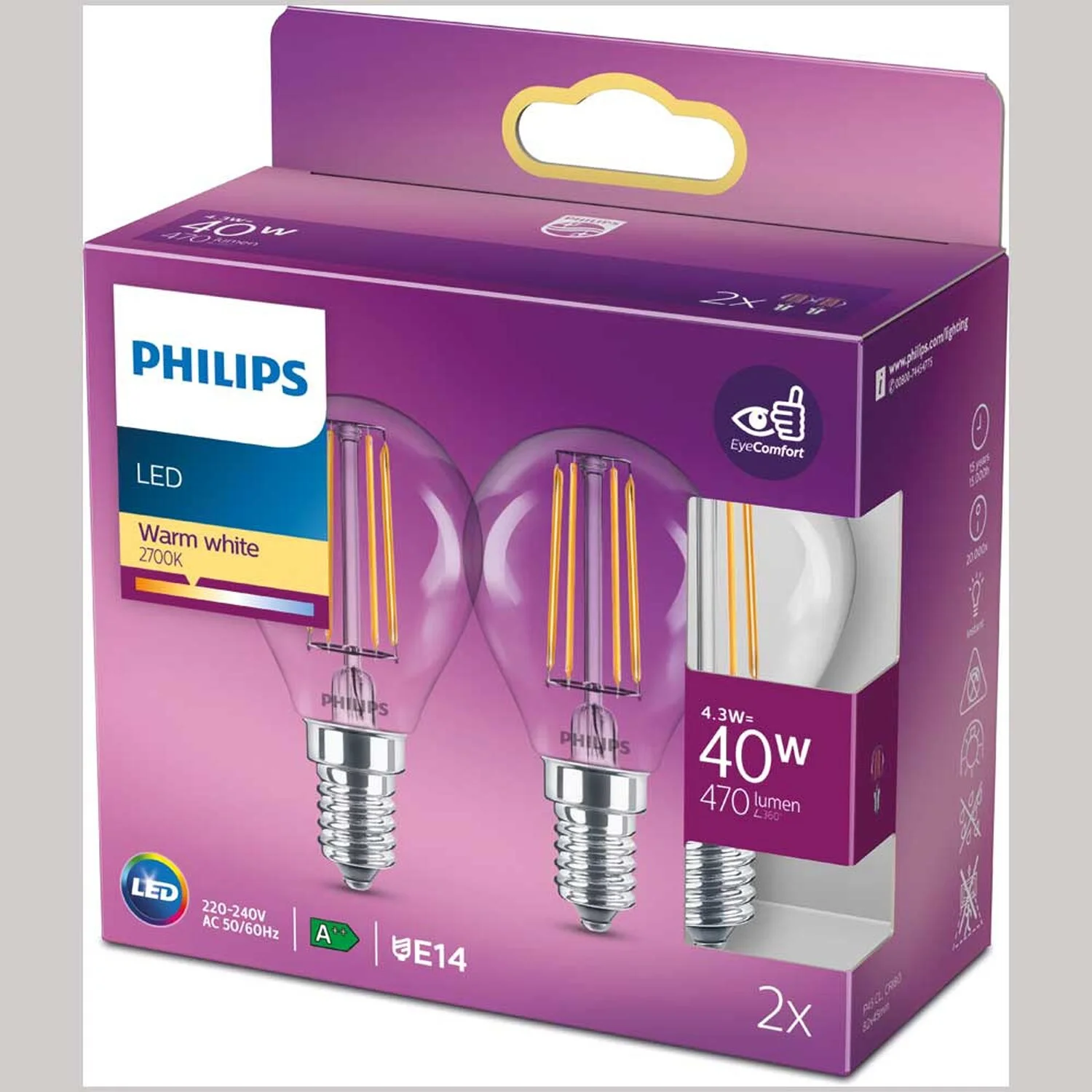Das Philips LED-Leuchtmittel E14 Tropfenform klar im 2er-Set ist die ideale Kombination aus vertrauter Glühlampenoptik, hochwertigem Glasdesign und warmweissem Licht. Somit ist dieses energiesparende LED-Leuchtmittel der perfekte nachhaltige Ersatz für herkömmliche Glühlampen. Es bietet sofort warmweisses Licht (2’700 K) wie bei herkömmlichen Glühlampen und schafft so die vertraute Atmosphäre, die Sie sich für Ihren Wohnraum wünschen. Dieses Philips LED-Leuchtmittel hat einen bis zu 85% geringeren Energieverbrauch im Vergleich zu herkömmlichen Glühlampen bei einer 10 mal höheren Nutzungslebensdauer. Seine äquivalente Leistung entspricht 40 W, die Nennleistung liegt bei 4,3 W.