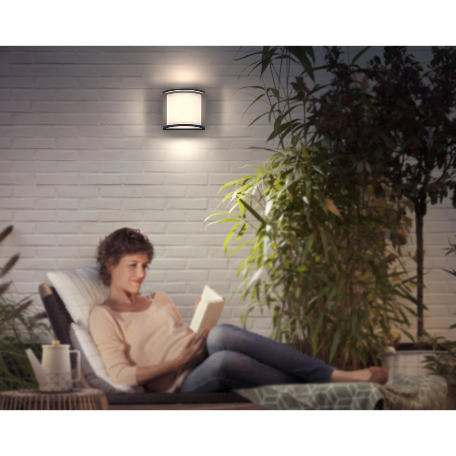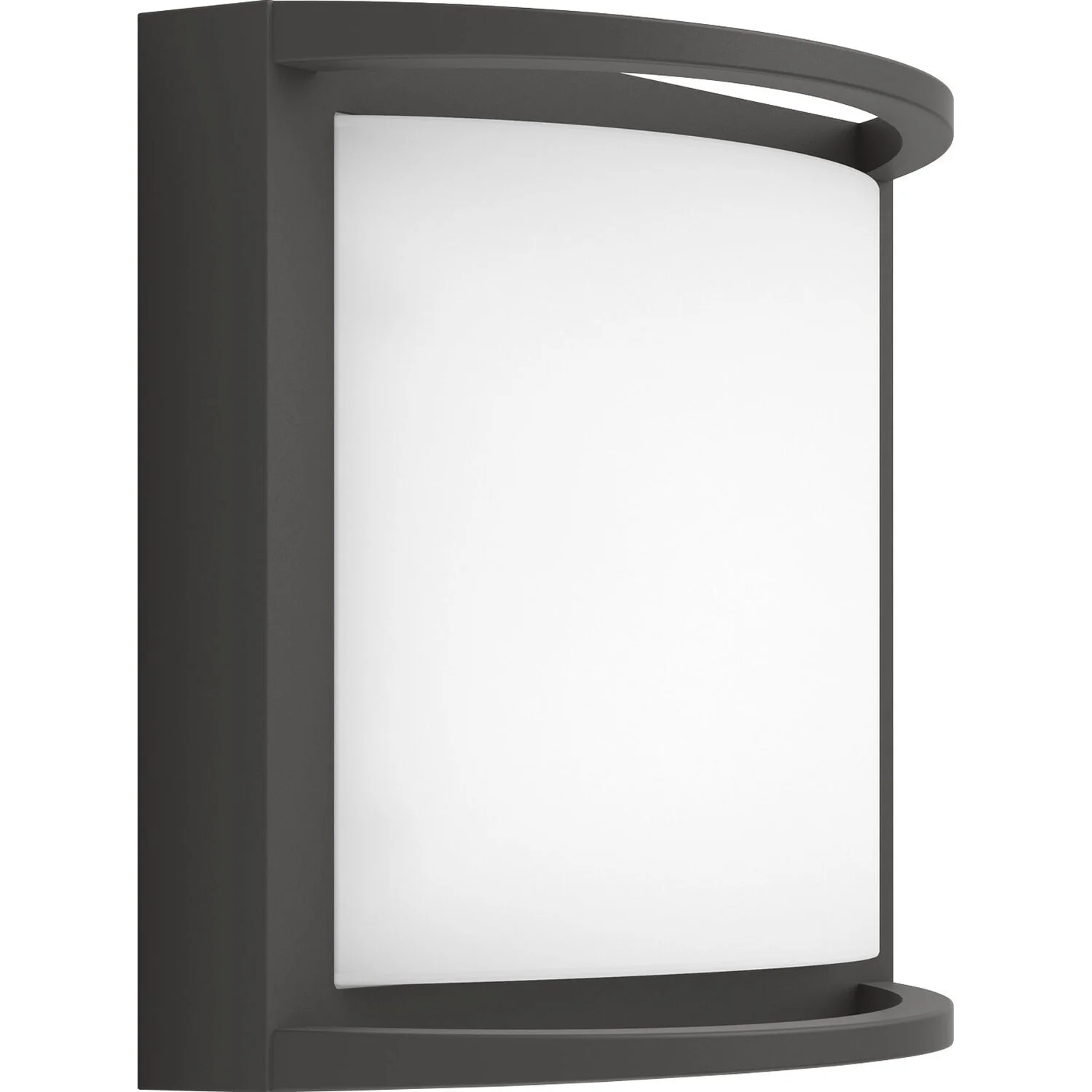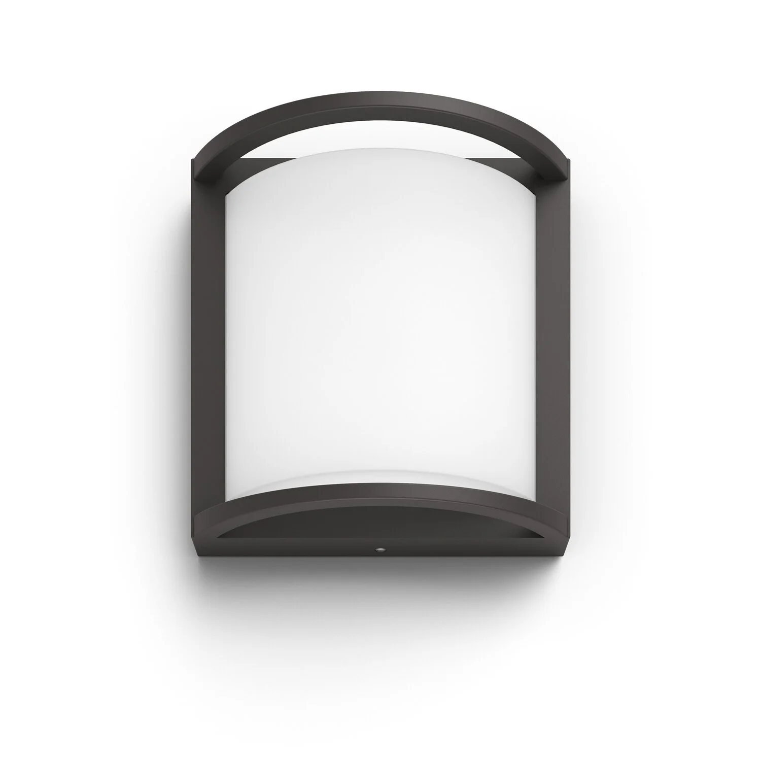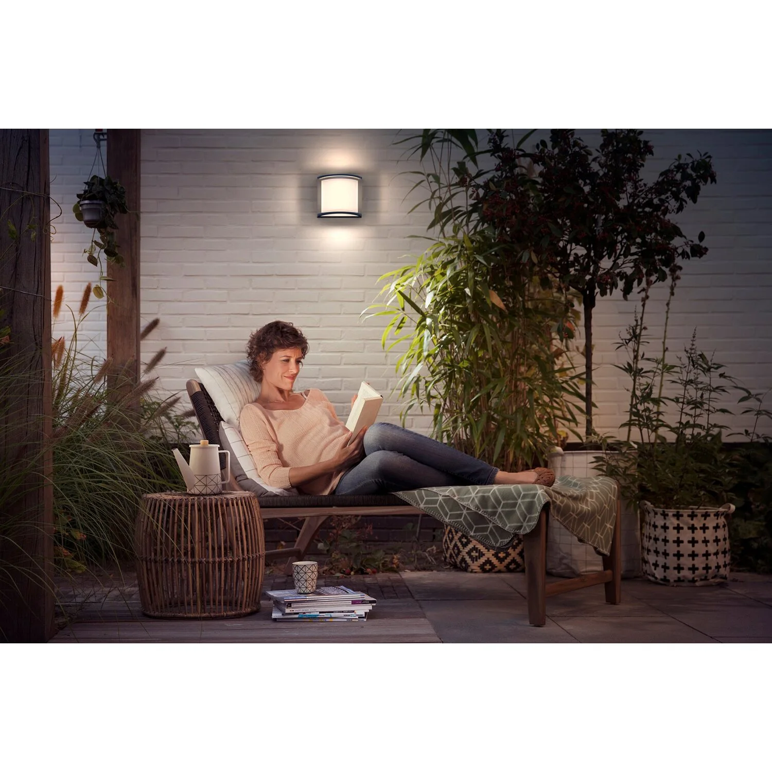 Die LED-Wandleuchte Samondra für aussen von Philips ist aus langlebigem anthrazitfarbenem Aluminium gefertigt. Die vertraute Dosenform wirft ein diffuses warmweisses Licht in alle Richtungen, um Aussenbereiche gleichmässig zu beleuchten.