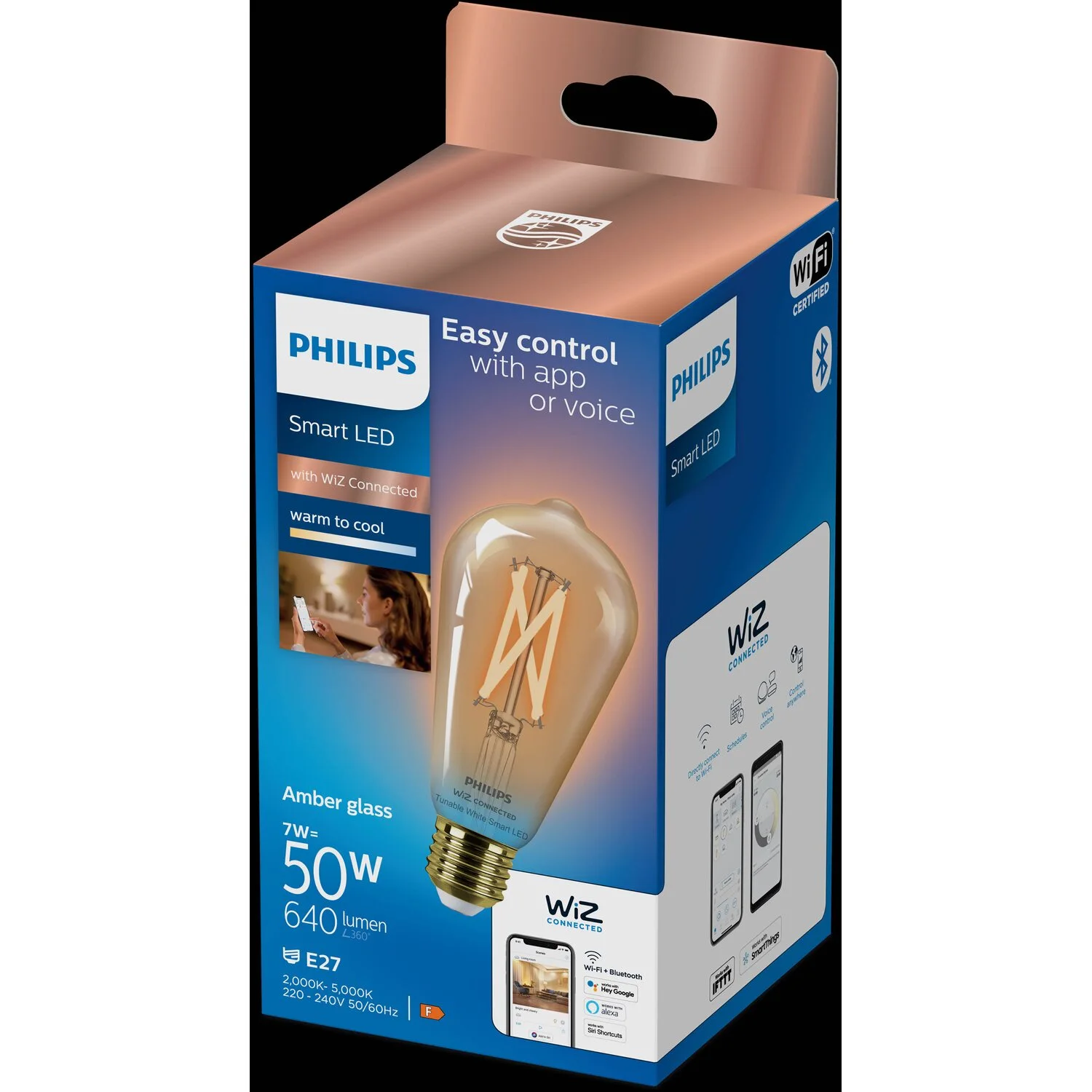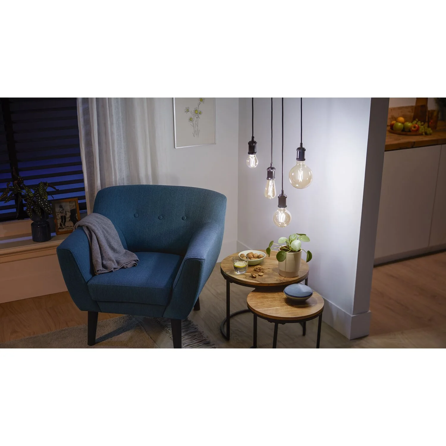 Das warm- bis kaltweisse Licht dieser Smart-LED von Philips in Edisonform und mit Amber-Beschichtung erzeugt in jedem Raum eine stimmungsvolle, gemütliche Atmosphäre. Das Leuchtmittel ist kompatibel mit WiZ Connected, das heisst, es kann mit der WiZ App oder per Sprachsteuerung über das vorhandene WLAN gesteuert werden.