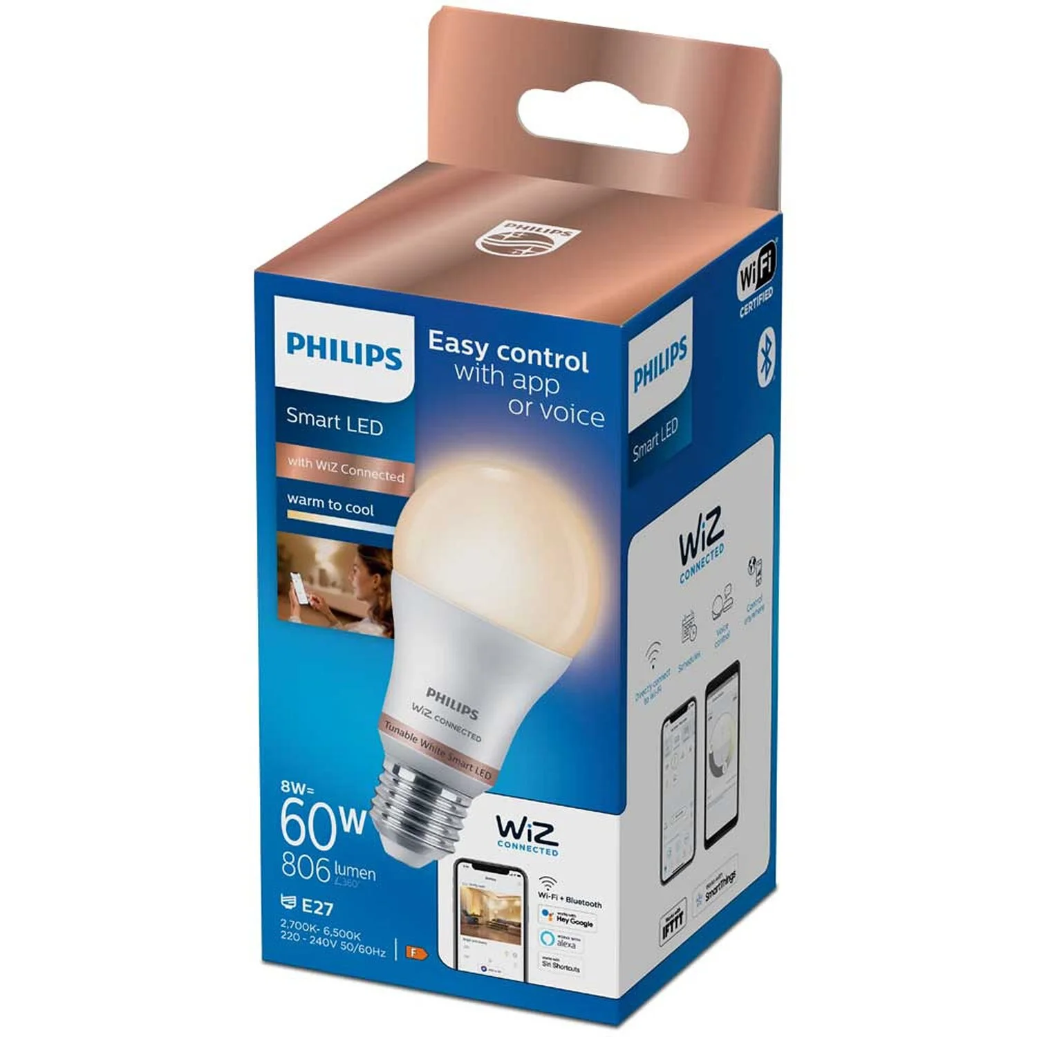Diese Smart-LED von Philips in Standardform erzeugt ein warm- bis kaltweisses Licht in jeder Abstufung. Das Leuchtmittel ist kompatibel mit WiZ Connected, das heisst, es kann mit der WiZ App oder per Sprachsteuerung über das vorhandene WLAN gesteuert werden.