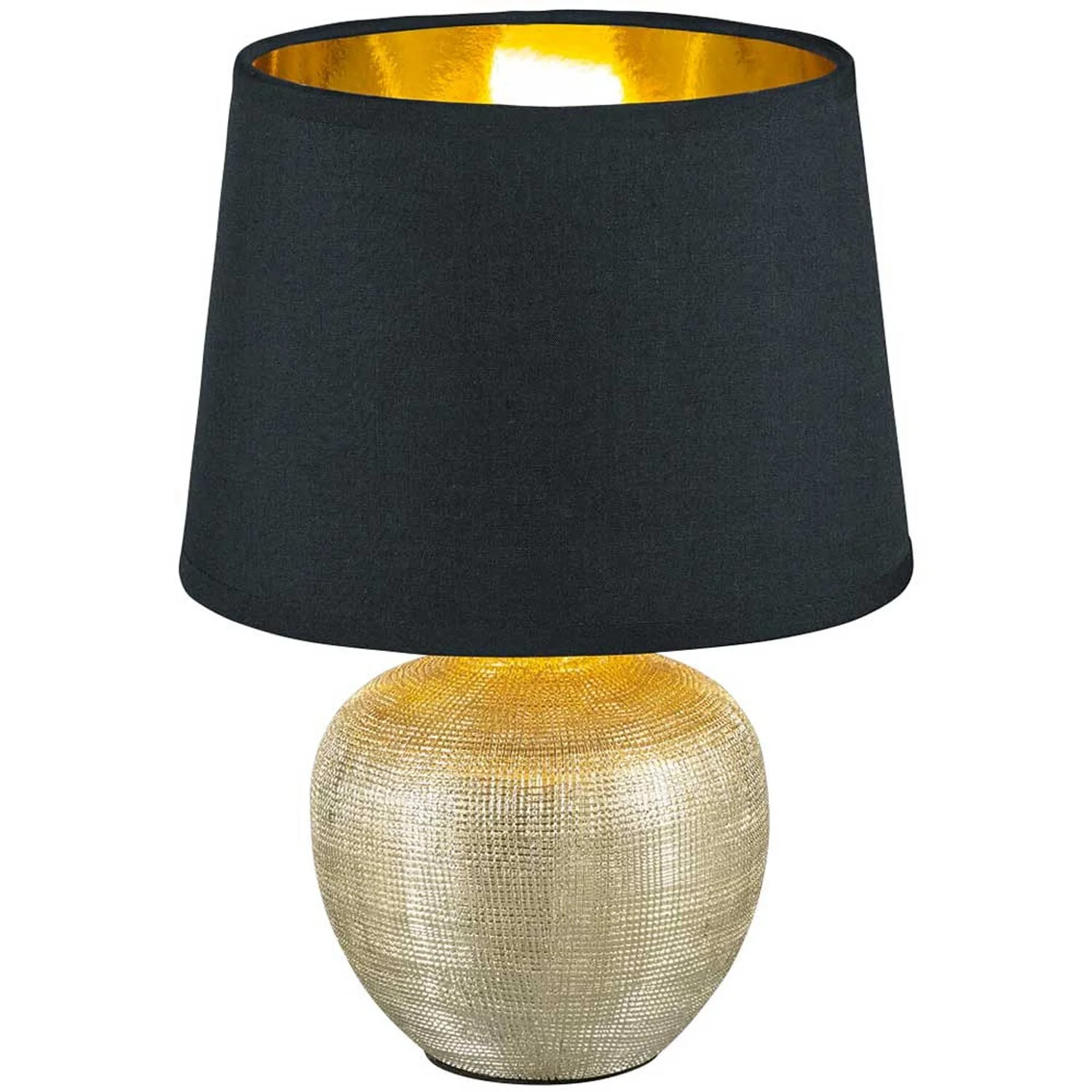 Für die elegante Tischleuchte Luxor ist schnell der richtige Platz gefunden, ob auf dem Sideboard, im Flur oder im Schlafbereich als Akzentlicht, die moderne Leuchte ist in jedem Wohnbereich ein wahrer Blickfang. Die Tischleuchte mit Schnurschalter hat einen Durchmesser von 18 cm und eine Höhe von 26 cm. Der goldfarbige Keramikfuss sorgt für ein angenehmes Ambiente und harmoniert perfekt mit dem schwarzen Stoffschirm der von innen ebenfalls goldfarbig ist. Für eine energiesparende Beleuchtung empfiehlt sich die Verwendung eines LED-Leuchtmittels. Diese sind eine optimale Alternative zu herkömmlichen Halogen-Leuchtmitteln und stehen für eine hohe Lichtqualität und eine Energieeinsparung von bis zu 80 %. Zusätzlich profitieren Sie bei LED-Leuchtmitteln von einer langen Lebensdauer, einer geringen Wärmeentwicklung und schonen gleichzeitig die Umwelt.