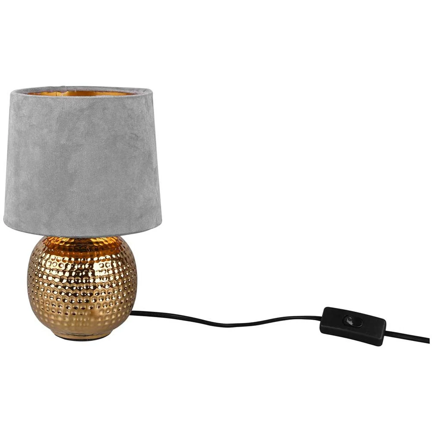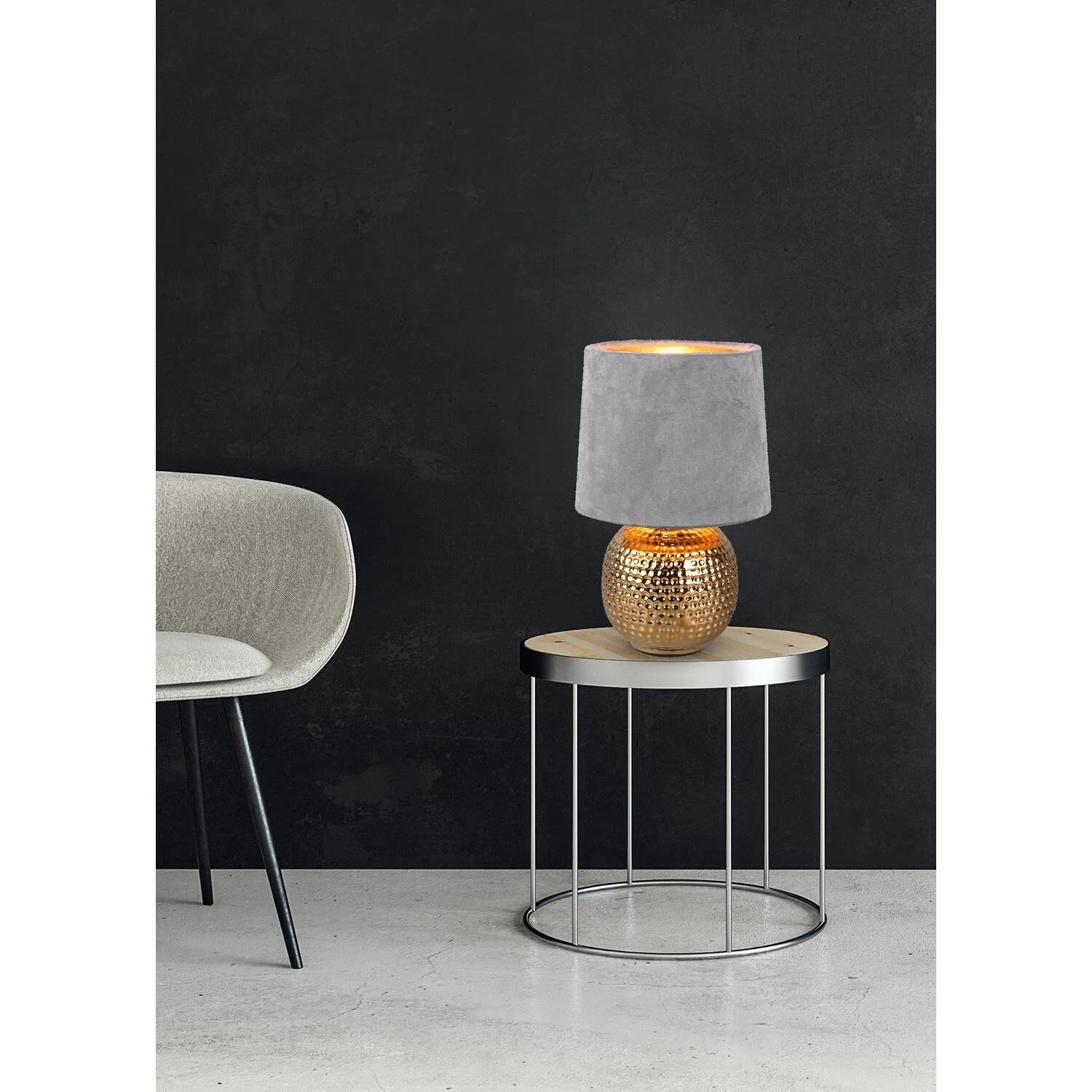 Garantiert ein Blickfang! Die Tischleuchte Sophia erscheint im modernen und auffälligen Design und zieht damit alle Blicke auf sich. Ob als Nachttischleuchte im Schlafzimmer, auf der Kommode oder auf dem Beistelltisch im Wohnzimmer, die Tischleuchte setzt dekorative Akzente. Gleichzeitig wird über den Lampenschirm ein warmes und sanftes Licht abgegeben, das für eine angenehme Lichtstimmung sorgt. Die Leuchte ist mit einem Schnurschalter ausgestattet, wodurch sie leicht ein- und ausschaltbar ist. Die Kombination, aus Keramik in Gold und dem Stoffschirm in Grau, sorgt für ein modernes Erscheinungsbild. Für eine energiesparende Beleuchtung empfiehlt sich die Verwendung eines LED-Leuchtmittels. Diese sind eine optimale Alternative zu herkömmlichen Halogen-Leuchtmitteln und stehen für eine hohe Lichtqualität und eine Energieeinsparung von bis zu 80 %. Zusätzlich profitieren Sie bei LED-Leuchtmitteln von einer langen Lebensdauer, einer geringen Wärmeentwicklung und schonen gleichzeitig die Umwelt.