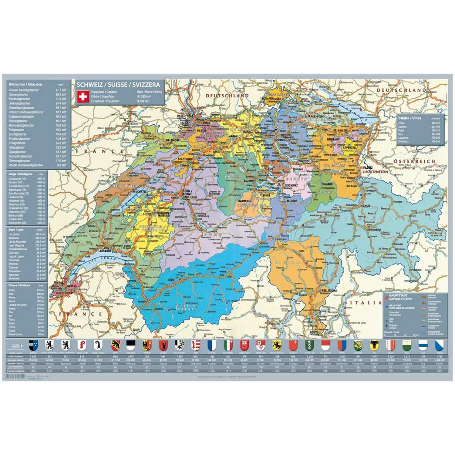 Die Schreibunterlage Schweizer Lernkarte eignet sich dank ihres Formats fast für jeden Schreibtisch. Diese Unterlage ist aus PVC hergestellt und bietet nicht nur einen optimalen, rutschfesten Schutz für den Schreibtisch, sondern liefert zusätzlich hilfreiche Informationen über die Schweiz. Auf dieser Unterlage sind alle Kantone, Städte, Seen, Strassen, Berge, usw. der Schweiz abgebildet. Ebenso verfügt sie über Höhenangaben von den Schweizer Bergen, Längenangaben von den Schweizer Seen, Einwohnerzahlen und vieles mehr. Wie praktisch – während einer Lern- oder Arbeitspause am Schreibtisch können Sie sich so ganz einfach geographische Informationen zu unserer schönen Schweiz aneignen.
