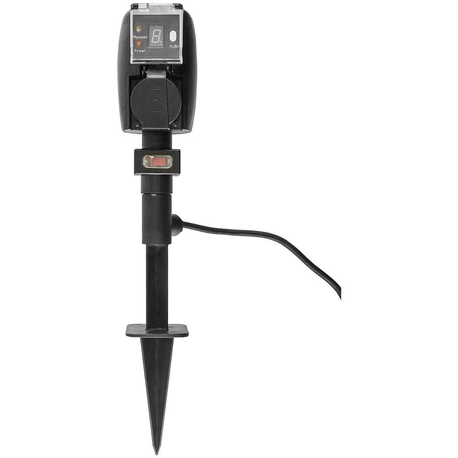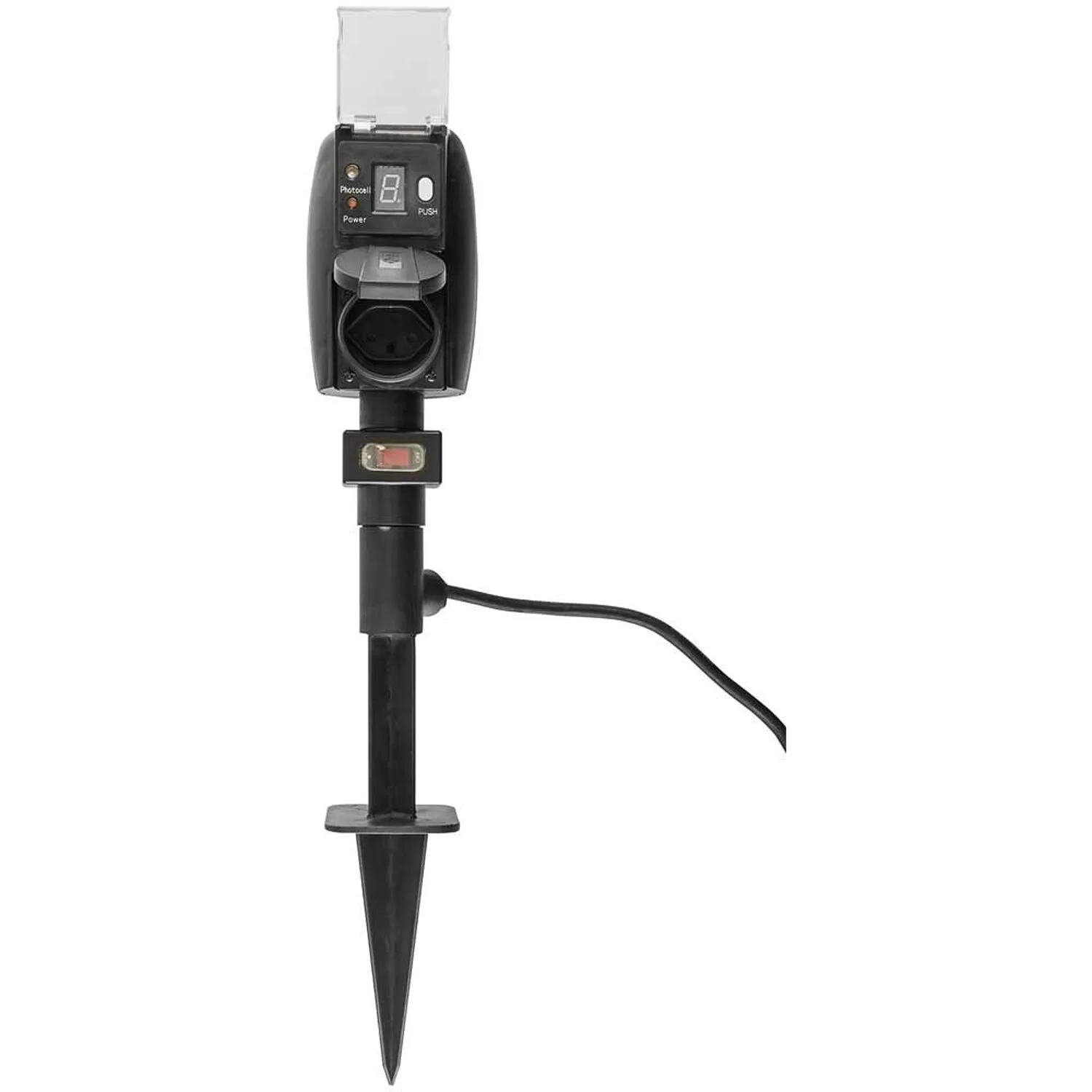 Dieser Steckdosen-Erdpfahl mit integriertem Dämmerungssensor bietet die optimale Lösung, um Ihre Stromkabel im Garten schnell und bequem anzuschliessen. Mit dem Dämmerungssensor können Sie zwischen den folgenden Programmierungen wählen: On, Off, automatische Schaltung gemäss Dämmerung, Zufallsmodus sowie eine Schaltung nach der Dämmerung oder nach sofortigem Einschalten für eine vordefinierte Zeit von einer bis neun Stunden. Durch das stabile, hochschlagfeste Material können Sie die 2 x T13-Steckdosen für Ihre Garten-Elektrifizierung verwenden, egal ob für den Rasenmäher, den Elektrogrill oder Ihre Aussenbeleuchtung. Dank dem 3-m-Gummikabel und dem integrierten Breaker Switch ist eine einfache und sichere Anwendung garantiert. Nutzen Sie unbegrenzte Einsatzmöglichkeiten im Aussenbereich und profitieren Sie von diesem hochwertigen Produkt, geprüft nach IP44.