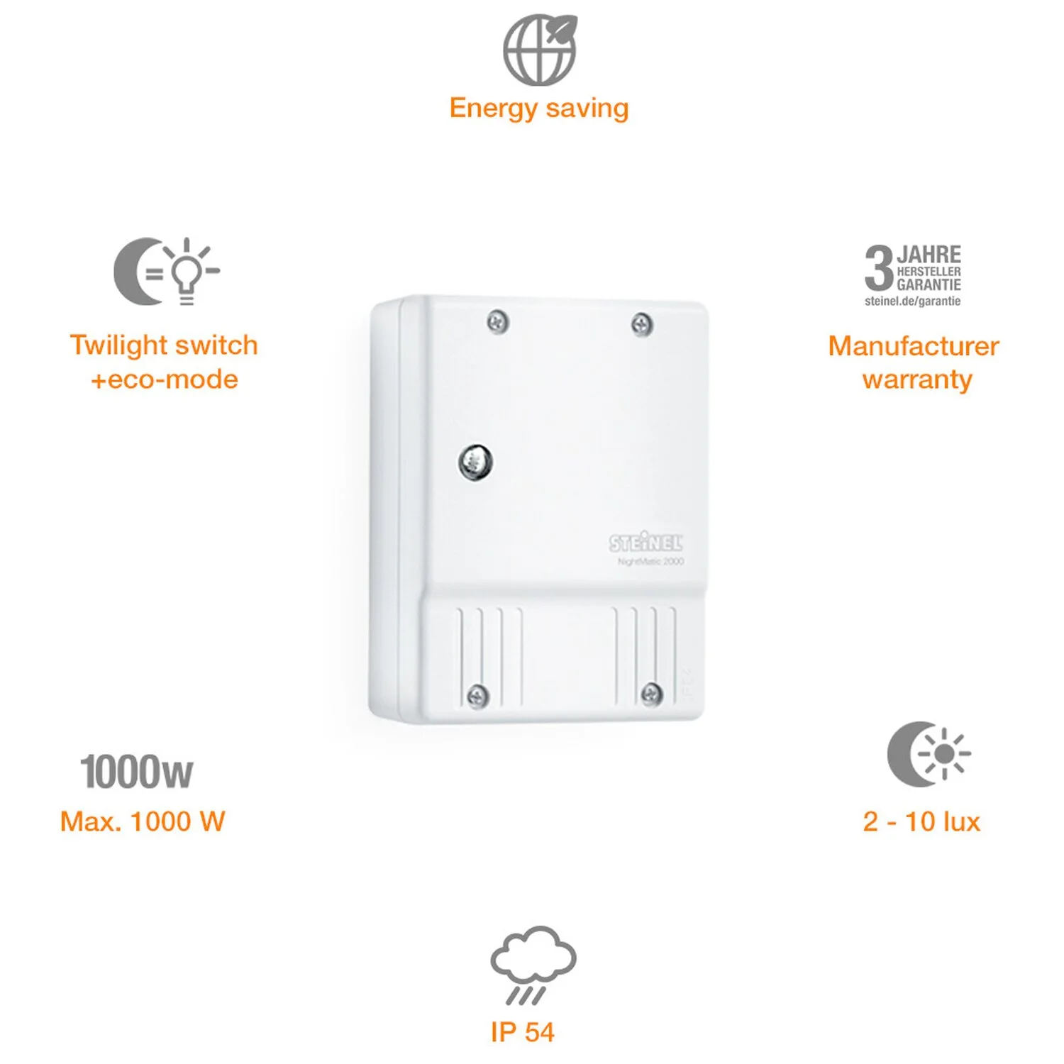 Der Steinel Dämmerungsschalter NightMatic 2000 in Weiss sorgt für automatische nächtliche Beleuchtung von Gebäudefronten, Grundstücken, Gärten und anderen Flächen.