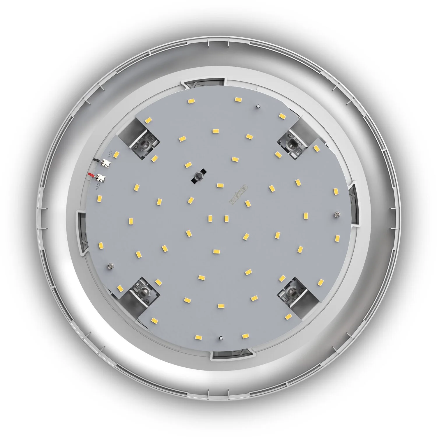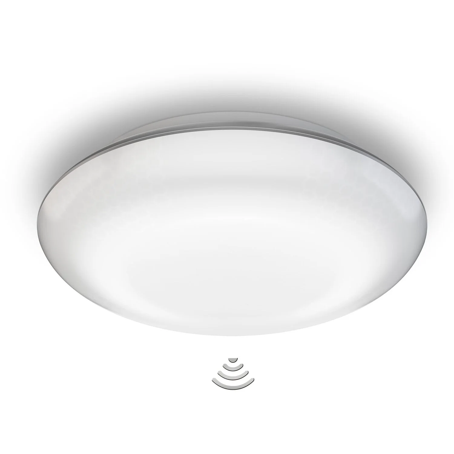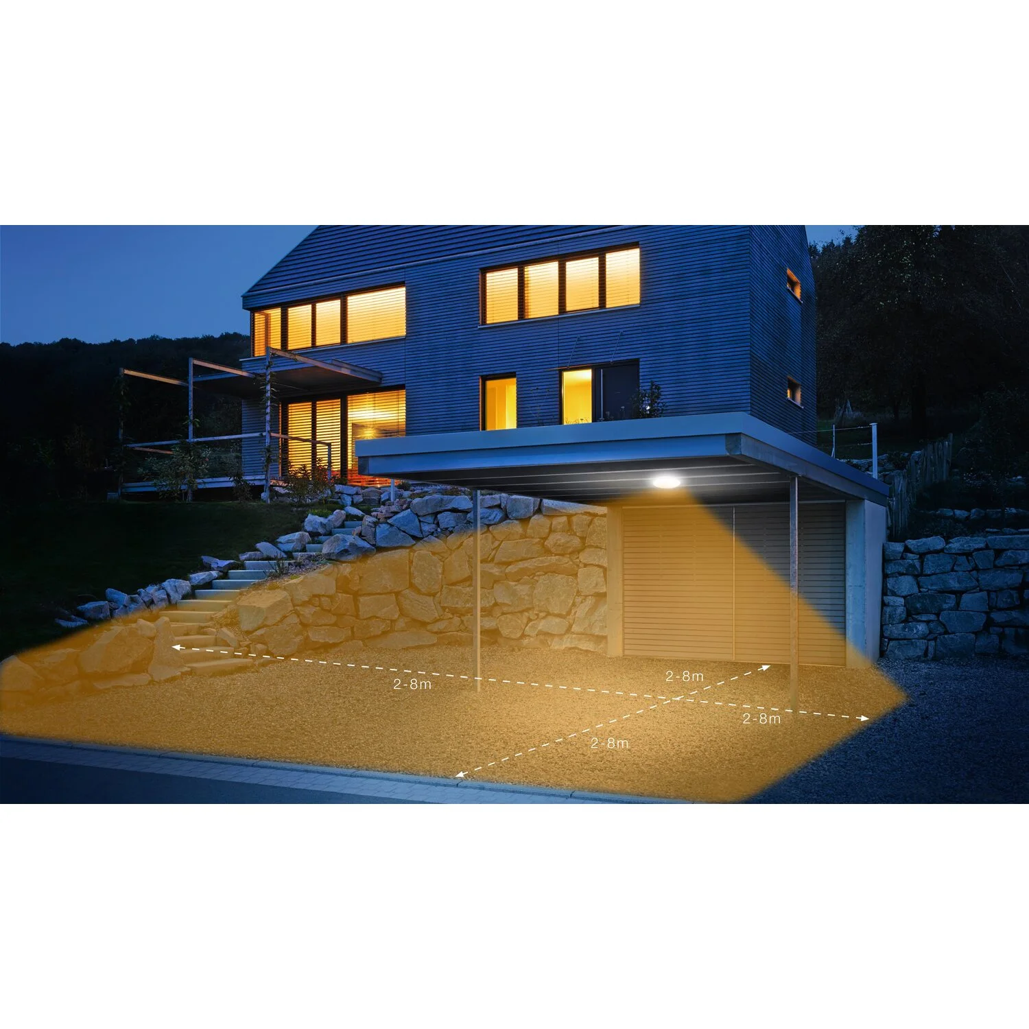 Die LED-Deckenleuchte mit präziser Erfassung. Die vier Infrarot-Sensoren lassen sich mechanisch in jede Richtung von 2 – 8 m individuell einstellen. Für eine optimale Anpassung an die örtlichen Gegebenheiten, wie z. B. Carports und Vordächer, ist die 360° Rundum-Erfassung bestens geeignet. Dabei fungiert die Leuchtenabdeckung gleichzeitig als Sensorlinse – eine patentierte Weltneuheit! Die Deckenleuchte strahlt mit 1’000 lm bei 10 W und kann in bis zu 6 m Höhe montiert werden, inklusive komfortabler Nachtlichtfunktion (10%) bei Dämmerung. Zudem hat sie ein schlagfestes Gehäuse.
