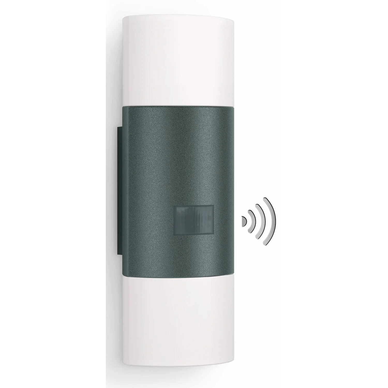Elegant und intelligent. Das LED Up-/Downlight L 910 LED ist ideal für Hauseingänge und -fronten. 11 W Steinel LED-Lichtsystem mit 755 lm, 30 Jahre Lebensdauer (Ø 4,5 h / Tag), 180° Infrarot-Sensor mit 12 Meter Reichweite, gleichzeitige Lichtschaltung bei vernetzten Leuchten, optionales Grundlicht, 4 h Dauerlicht optional. Steinel LED-Lichtsystem: Effizient, langlebig und zukunftsweisend. Mehr Lebensqualität, Sicherheit und Energieersparnis durch intelligente Sensor- und LED-Technik von Steinel. Hochinnovative Sensoren reagieren auf Bewegungen und Lichtverhältnisse und schalten das Licht verzögerungsfrei automatisch ein und nach einstellbarer Zeit wieder aus. Ein intelligentes und elegantes Ambientelicht. Das Steinel Up-/Downlight L 910 LED setzt besondere Lichtakzente an Hausfront und Eingang. Das Spiel mit Hell-/Dunkel-Effekten schafft eine einzigartige Symbiose aus Architektur und Licht. Technisch ist das Up-/Downlight mit allen Features und Extras ausgestattet, die eine nachhaltige Lichttechnik auszeichnet. Das leistungsstarke, energieeffiziente 11 W Steinel LED-Lichtsystem mit der warm-weissen Lichttemperatur von 3’000 K und seiner bis zu 30-jährigen Lebensdauer lässt keinen Gedanken an Leuchtmittelwechsel aufkommen. Der 180° Infrarotsensor hat eine Reichweite von bis zu 12 Meter. Es lässt sich zudem eine verringerte Empfindlichkeit einstellen wodurch die Reichweite auf maximal 5 Meter beschränkt wird. Die Montagehöhe sollte für eine optimale Erfassung 2,2 Meter nicht überschreiten. Effektlicht an der Wand, Zeit- und Dämmerungsschwelle sind einstellbar. 4 Stunden Dauerlicht ist optional schaltbar. Die hohe Steinel Produkt-Qualität und das spritzwassergeschützte Gehäuse (IP 44) gewährleisten eine überdurchschnittliche Lebensdauer.