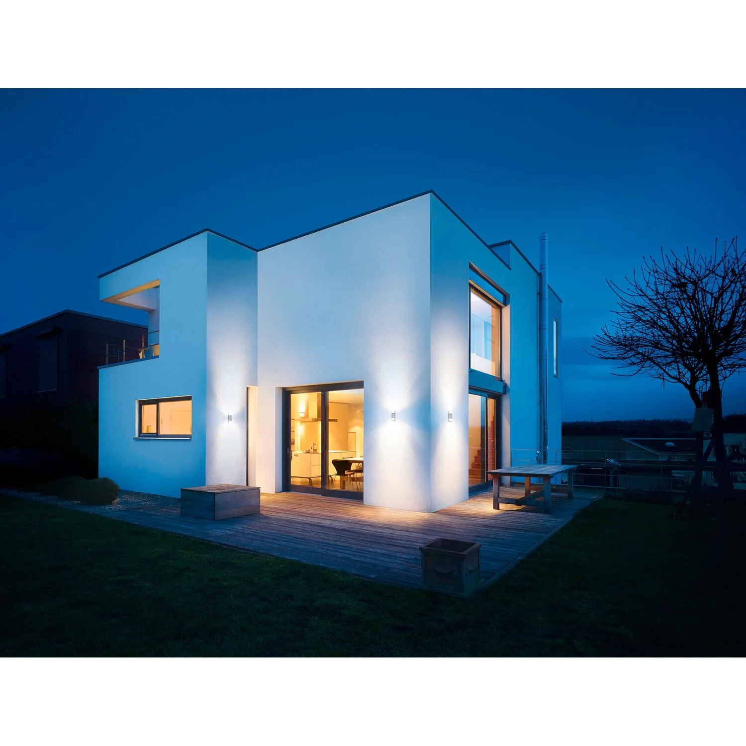 Elegant und intelligent. Das LED Up-/Downlight L 910 LED, ideal für Hauseingänge und -fronten. 11 W Steinel LED-Lichtsystem mit 755 lm, 30 Jahre Lebensdauer (Ø 4,5 h / Tag), 180° Infrarot-Sensor mit 12 Meter Reichweite, gleichzeitige Lichtschaltung bei vernetzten Leuchten, optionales Grundlicht, 4 Stunden Dauerlicht optional.