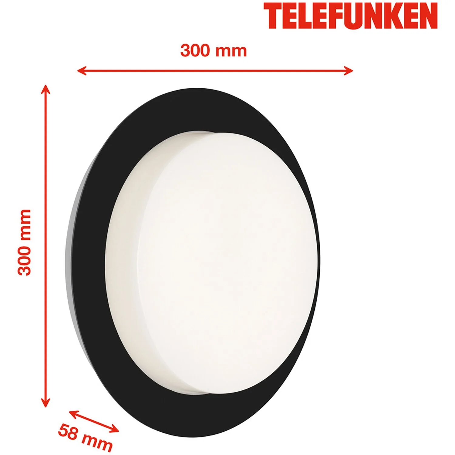 Die runde Telefunken Aussenleuchte Lyon in der Farbe Schwarz wirkt durch ihr schlichtes Design sehr elegant und passt an jede Hauswand. Die Leuchte enthält eine LED-Platine mit 15 W und 1’500 lm. Sie strahlt ein neutralweisses Licht aus und hat mit 25’000 Stunden eine hohe Lebensdauer. Durch die Schutzart IP44 kann sie problemlos im Freien montiert werden und ist gut vor Regen geschützt. Die Leuchte hat eine Höhe von 58 mm und einen Durchmesser von 300 mm.
