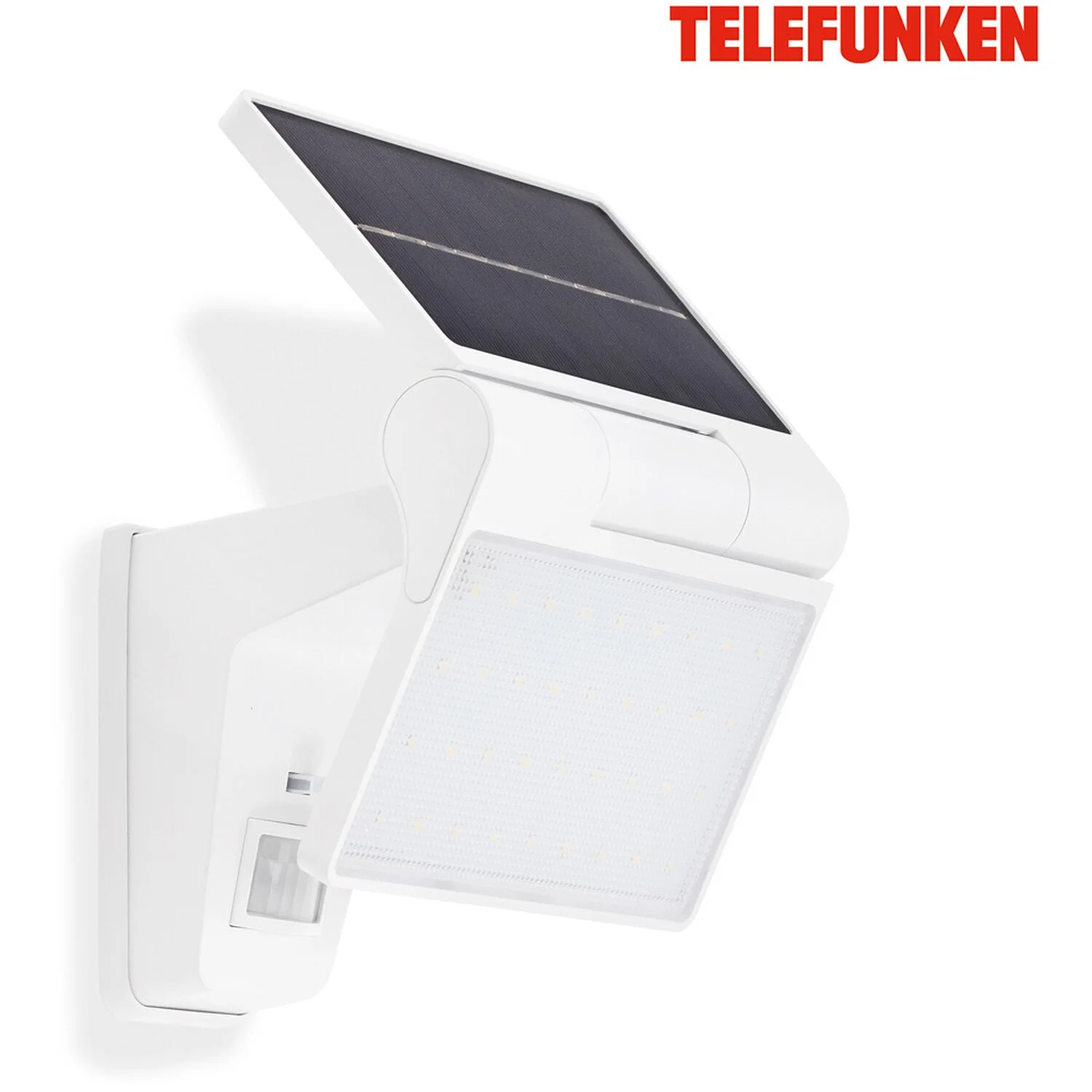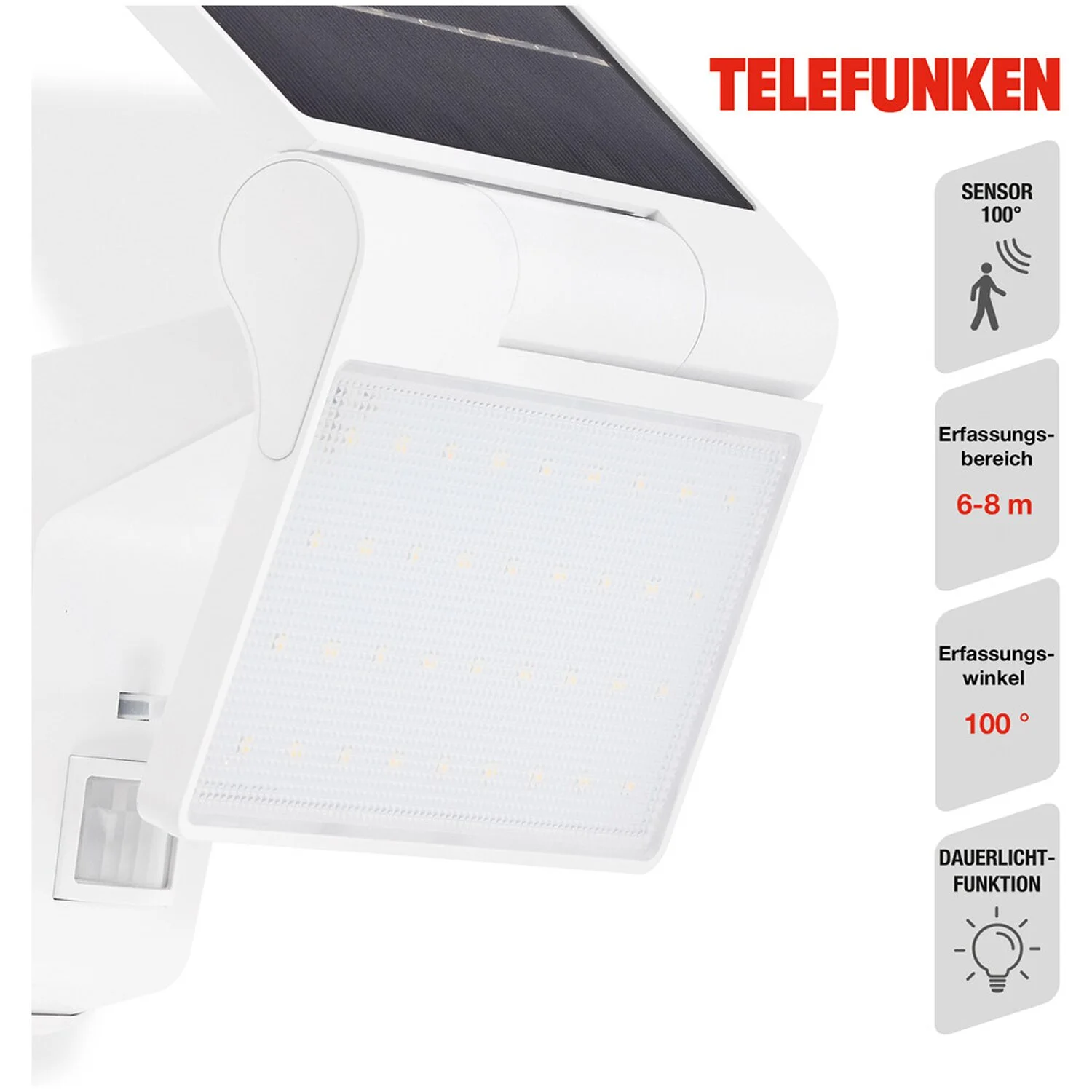 Der weisse Telefunken LED-Solar-Aussenstrahler der Serie Metz mit Sensor bietet eine optimale Ausleuchtung vor allem in Bereichen ohne Stromzugang. Er hat eine fest verbaute LED-Platine mit 3 W und 420 lm. Er erstrahlt in einem neutralweissen Licht mit 4’000 K und hat eine Lebensdauer von 25’000 Stunden. Der Erfassungsbereich liegt bei 6 – 8 m und der Erfassungswinkel bei 100°. Die Aussenleuchte hat die Schutzart IP44, wodurch sie vor Spritzwasser gut geschützt ist. Die Leuchte verfügt über einen Schalter, mit dem sie an- und ausgeschaltet (ON/OFF) oder in den Sensormodus (PIR) geschaltet werden kann. Bei Dauerlicht hat die Leuchte 15 lm. Die Leuchtdauer bei voll geladenem Akku beträgt 8 Stunden. Der Sensor hat 300 lm und bei voll geladenem Akku eine Leuchtdauer von 60-mal 30 Sekunden. Im Lieferumfang ist eine Batterie (3,7 V, 2’000 mAh) enthalten. Die Masse der Leuchte betragen (HxBxT) 126 x 229 x 152 mm.