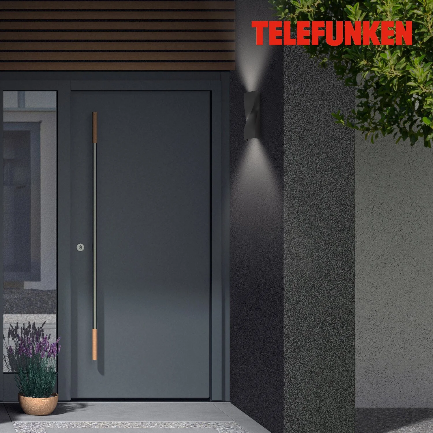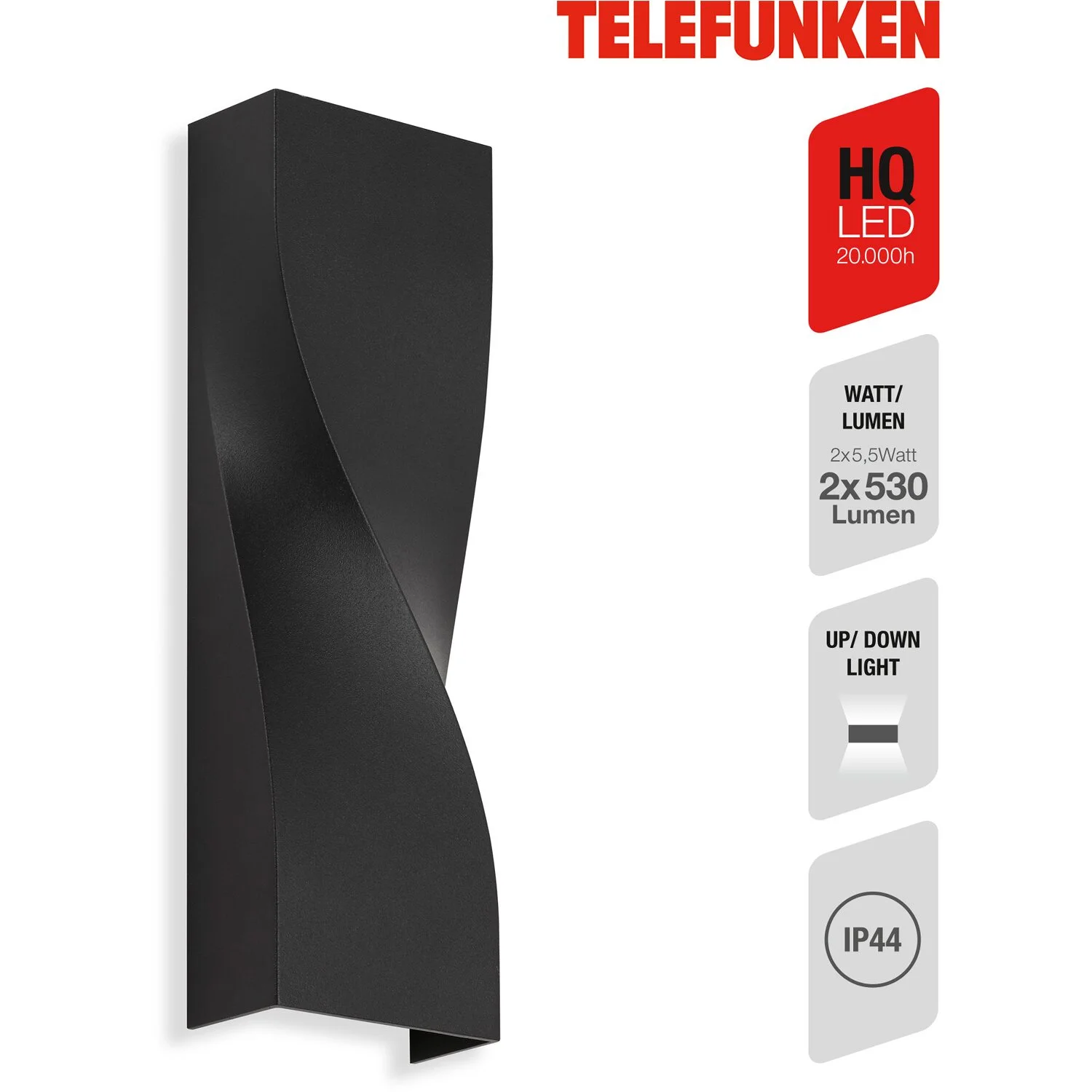 Die schwarze Telefunken LED-Aussenwandleuchte Brügge macht sich super an jeder Hauswand. Die 2 eingebauten LED-Platinen haben eine Leistung von jeweils 5,5 W und 530 lm. Mit 4’000 K strahlt sie ein angenehm neutralweisses Licht aus. Dank Schutzart IP44 ist die Leuchte vor Spritzwasser gut geschützt.
