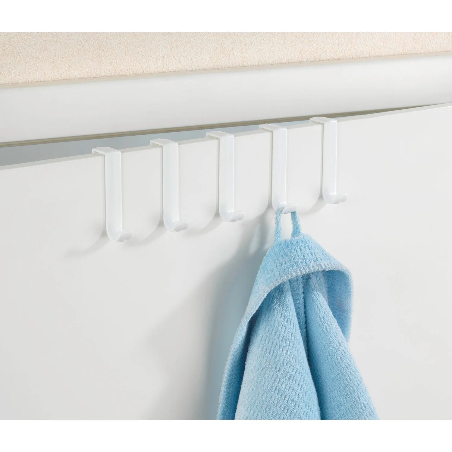 Die praktischen Türgarderobenhaken von Wenko aus strapazierfähigem, weissem Kunststoff sind im 5er-Set erhältlich. Die Anbringung ist kinderleicht: Die Haken werden einfach am oberen Türrand (Türfalzstärken bis 2 cm) eingehängt. Ideal eignen sich die nützlichen Helfer zum Aufhängen von Kleidung oder Hand-, Dusch- und Badetüchern im WC, im Badezimmer und im gesamten Haushalt.