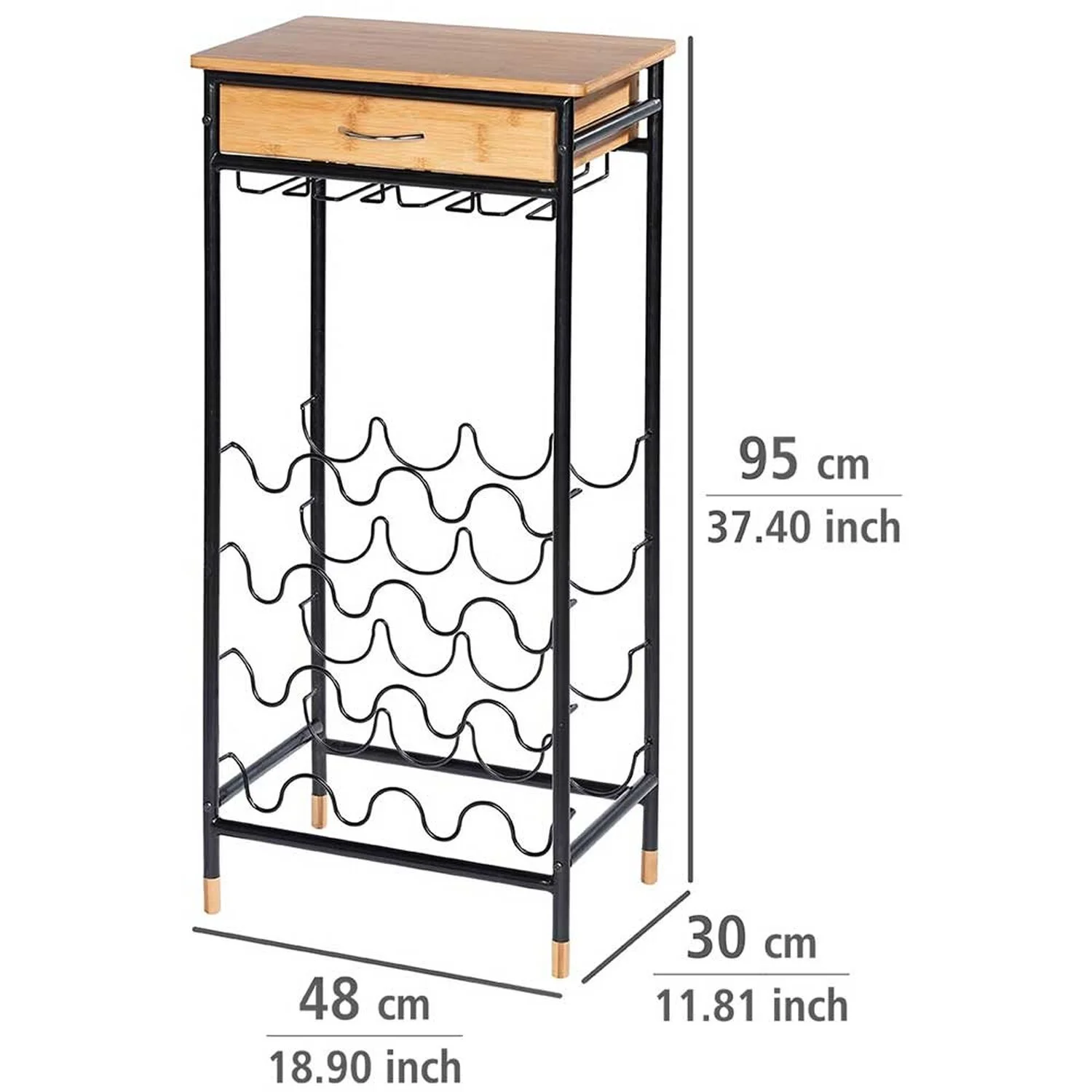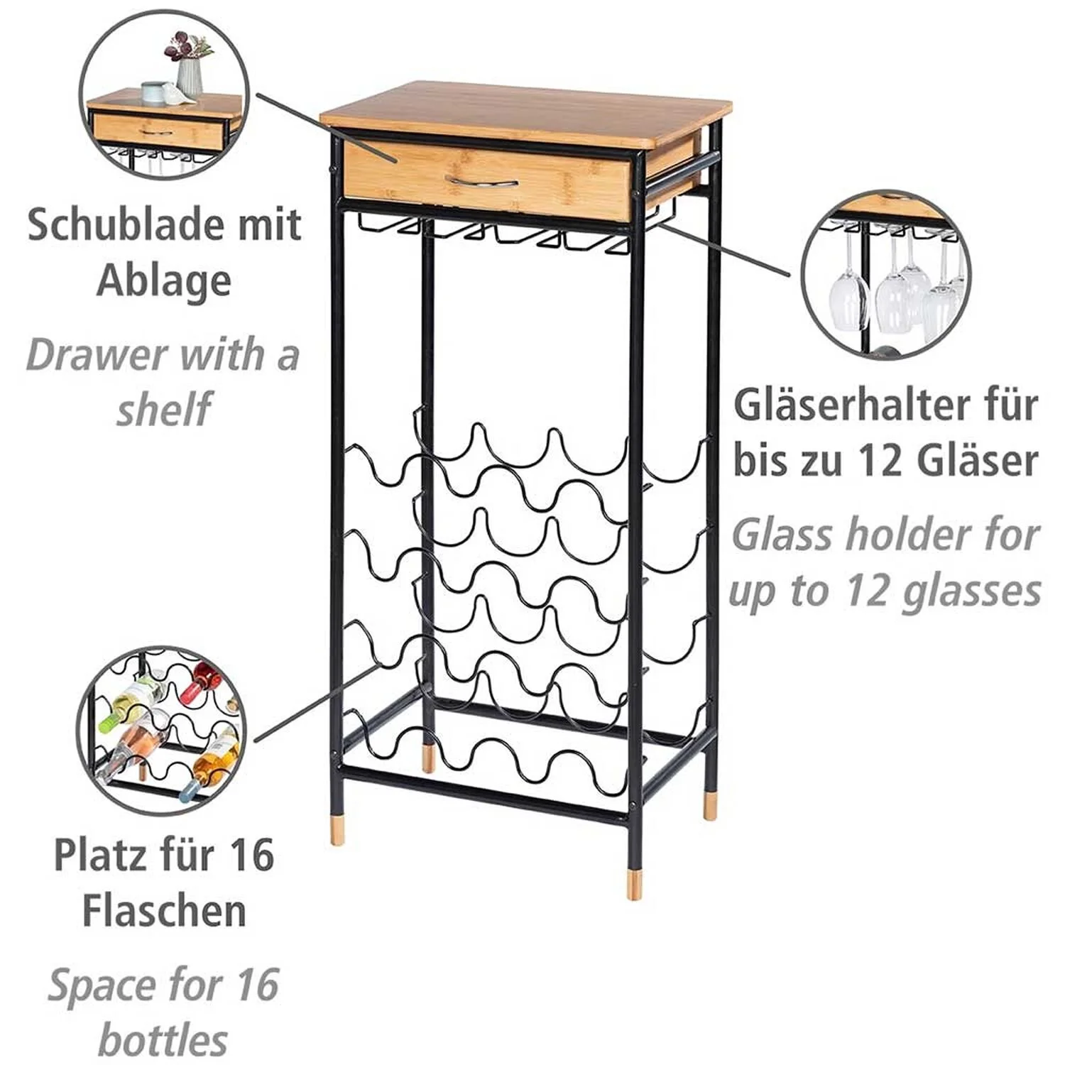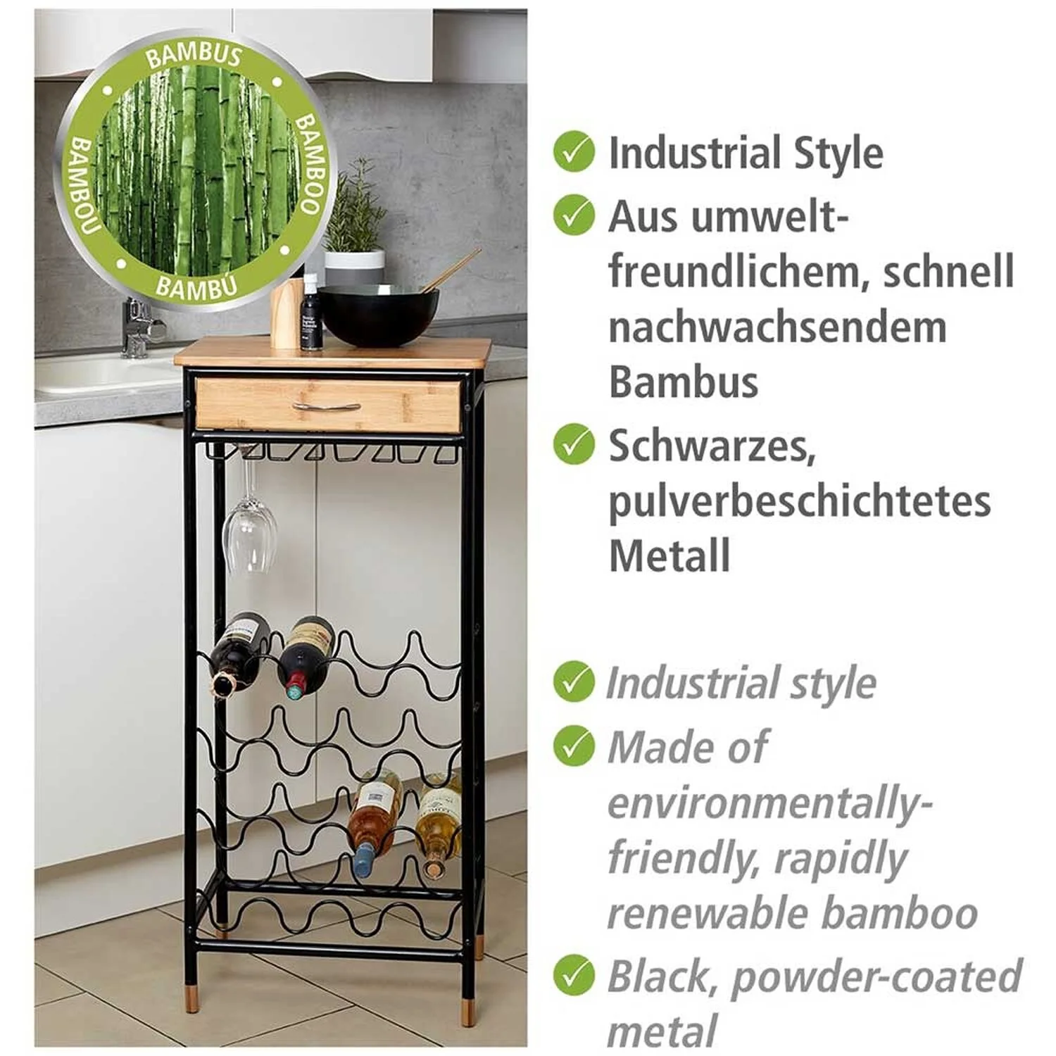 Das trendige Weinregal von Wenko aus pulverbeschichtetem Metall und nachhaltigem Bambus im Industrial Style ist ein Must-Have für Weinliebhaber. Bis zu 16 Weinflaschen werden hier in perfekter Lage aufbewahrt. Zudem bietet es einen Gläserhalter für bis zu zwölf Wein- oder Sektgläser. Die Schublade und Ablage machen das Regal zum perfekten Helfer bei einem gemütlichen Abend. Es passt zu vielen anderen Artikeln der Serie Loft.