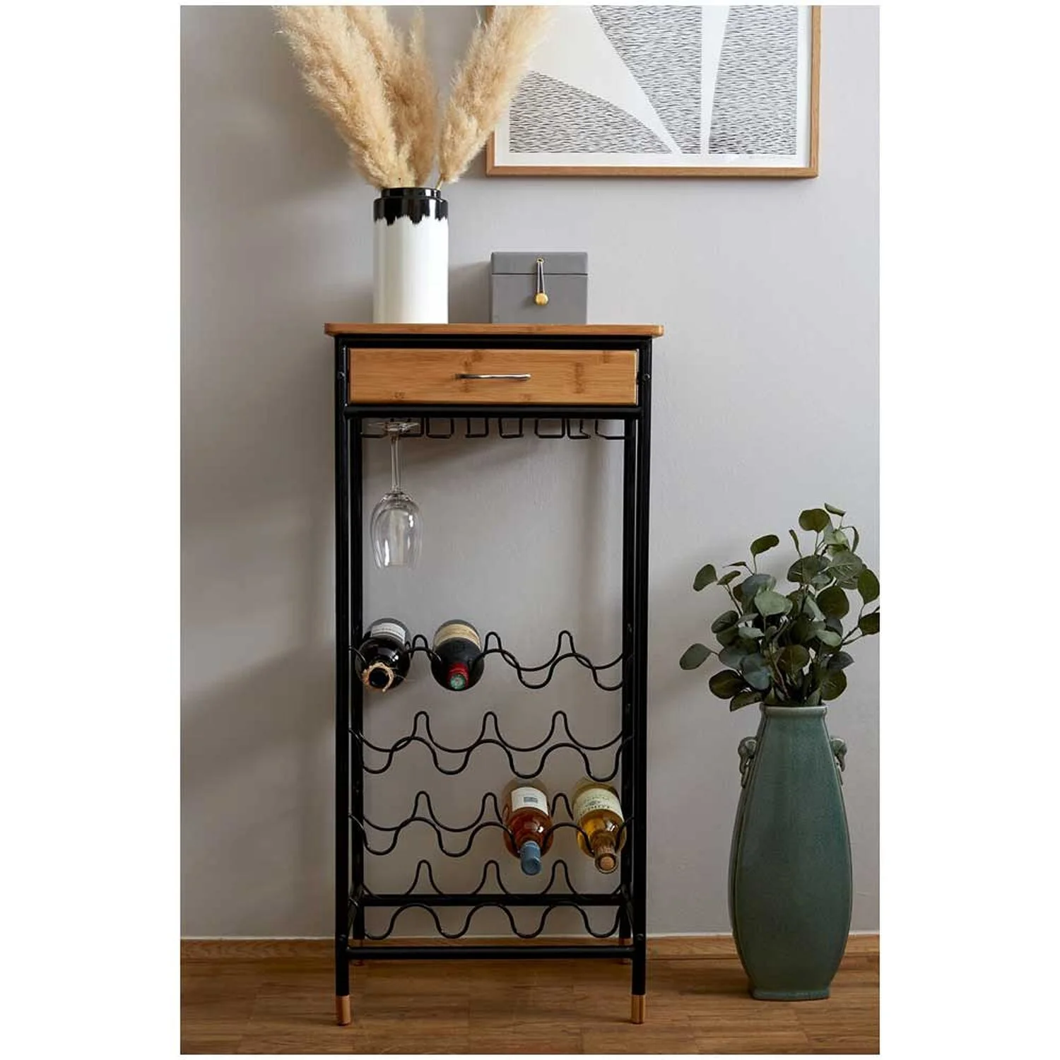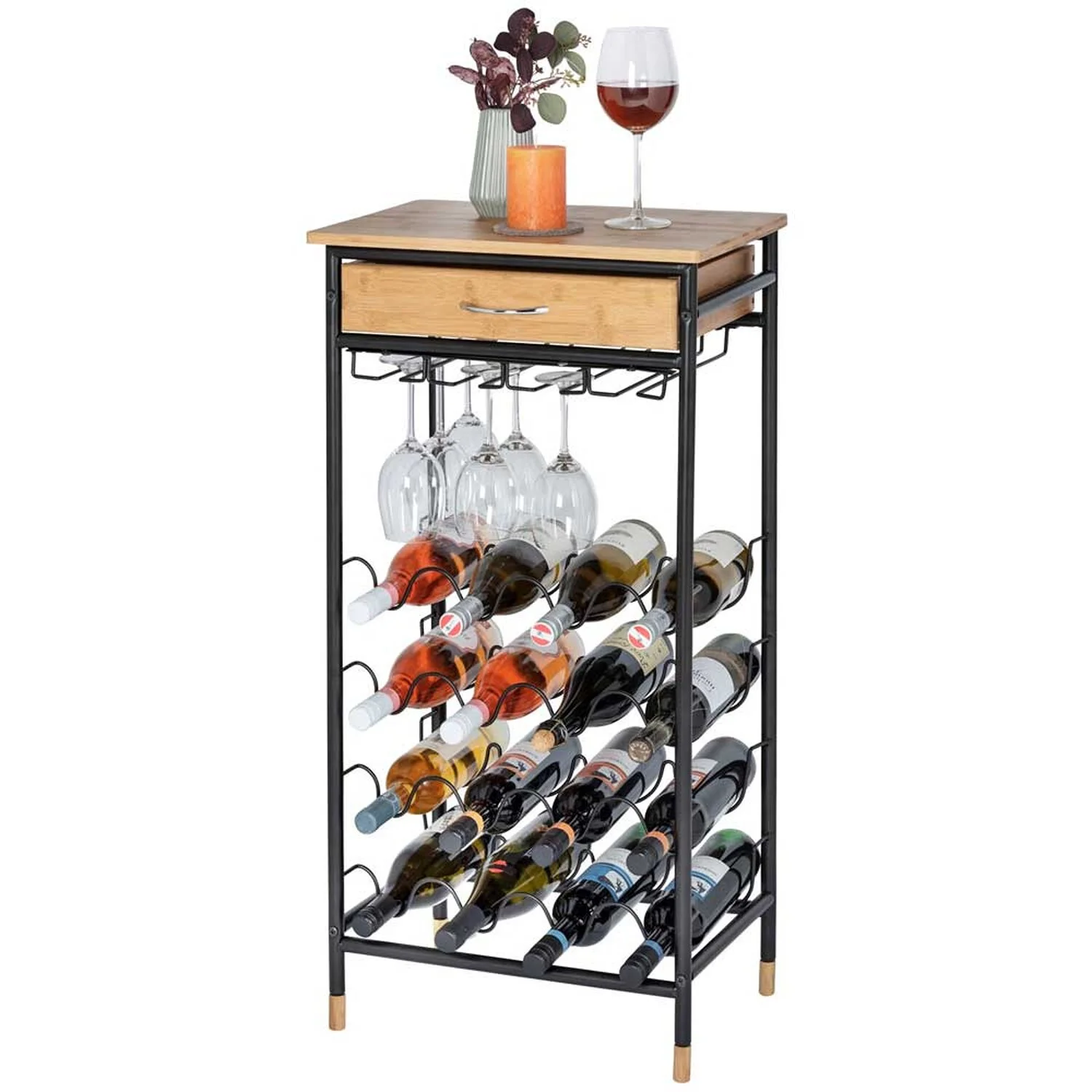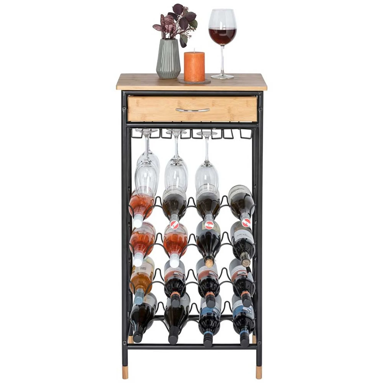 Das trendige Weinregal von Wenko aus pulverbeschichtetem Metall und nachhaltigem Bambus im Industrial Style ist ein Must-Have für Weinliebhaber. Bis zu 16 Weinflaschen werden hier in perfekter Lage aufbewahrt. Zudem bietet es einen Gläserhalter für bis zu zwölf Wein- oder Sektgläser. Die Schublade und Ablage machen das Regal zum perfekten Helfer bei einem gemütlichen Abend. Es passt zu vielen anderen Artikeln der Serie Loft.