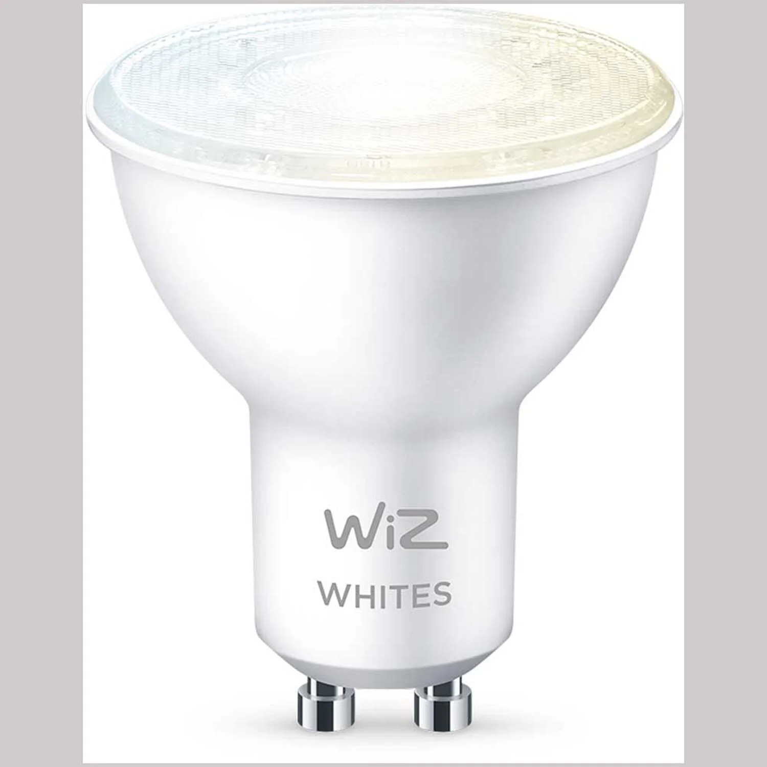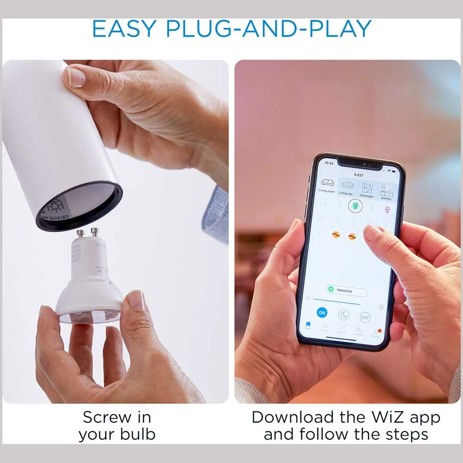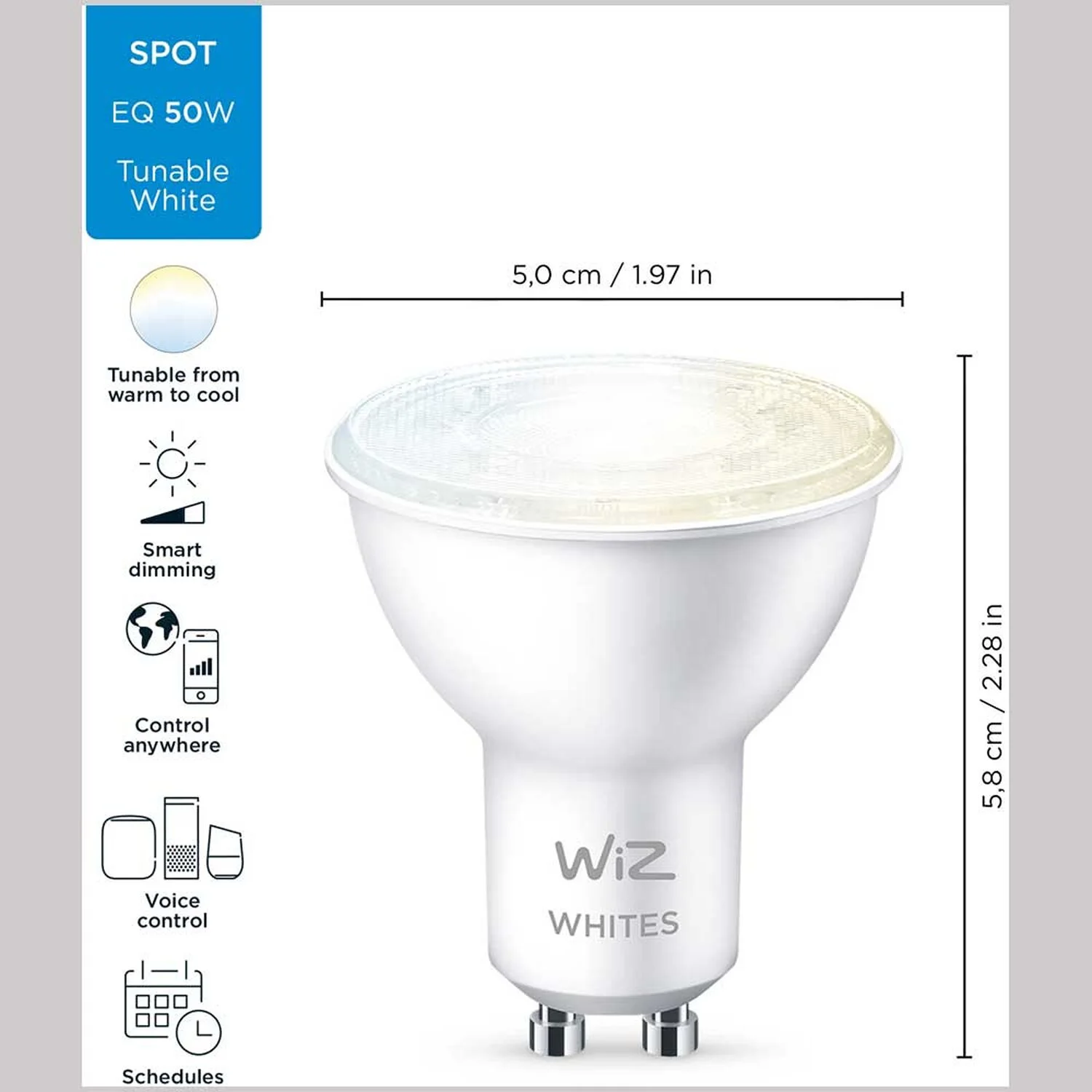 Mit dem smarten WiZ LED-Leuchtmittel GU10 Reflektor WiFi Bluetooth Whites 50 W holen Sie sich das ultimative Lichterlebnis in Ihr Zuhause. Die patentierte WiZ-Technologie ermöglicht Ihnen die volle Kontrolle über alle Lampen – egal ob sie über WLAN, mobile Datennetze, die Infrarot-Fernbedienung oder die vorhandenen Schalter erfolgt. Schaffen Sie das Ambiente Ihrer Wahl warm- bis tageslichtweissem Licht (2’700 – 6’500 K) – je nachdem ob Sie sich konzentrieren oder entspannen wollen. Sie können Routinen zum Ein- und Ausschalten des Lichts für Ihre täglichen oder wöchentlichen Aktivitäten einrichten, oder das Licht mit Ihrem Smartphone oder Ihrer Stimme steuern.