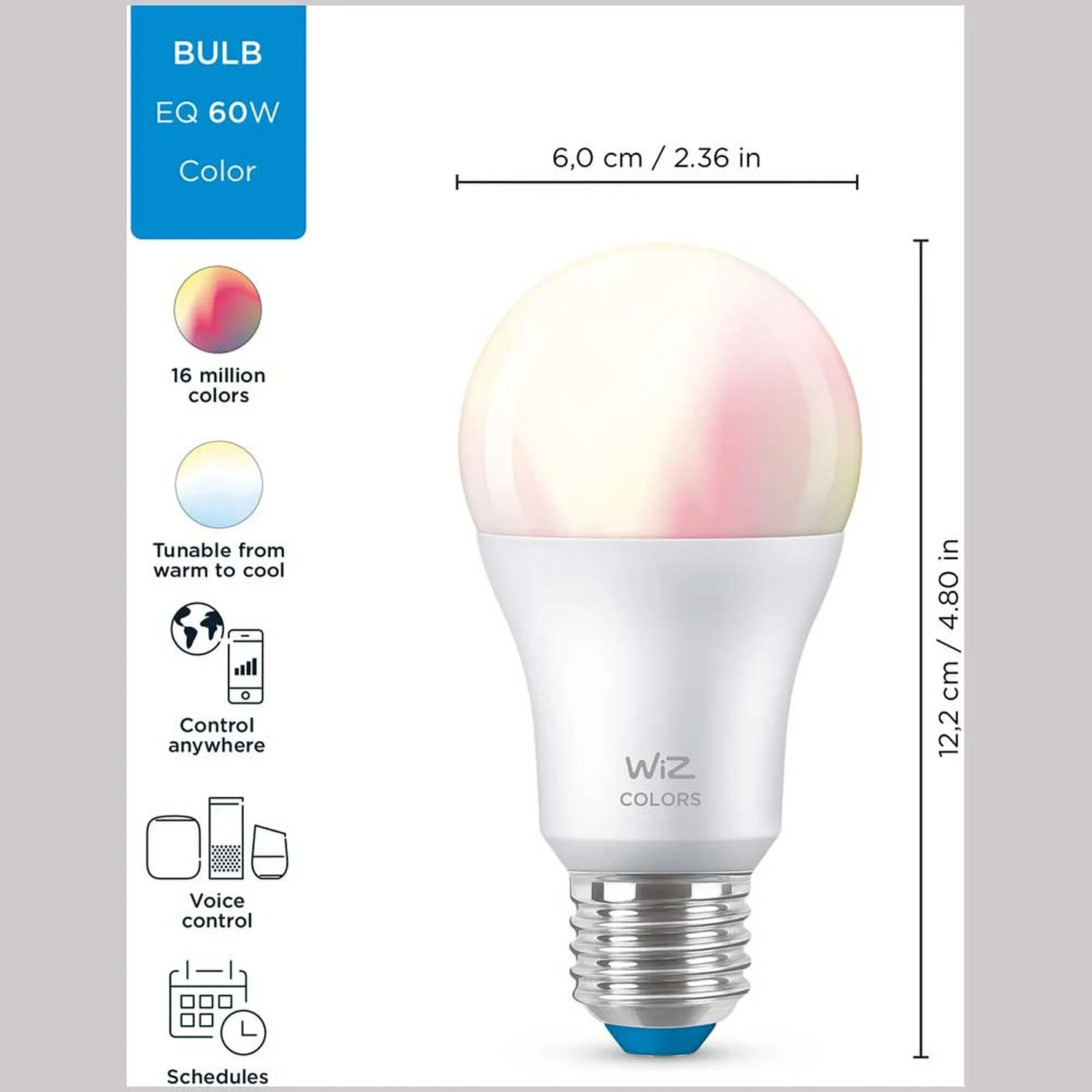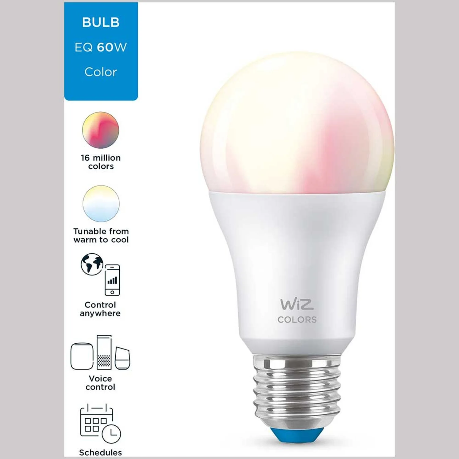 Mit dem smarten WiZ LED-Leuchtmittel E27 Standardform WiFi Bluetooth Colors holen Sie sich das ultimative Lichterlebnis in Ihr Zuhause. Die patentierte WiZ-Technologie ermöglicht Ihnen die volle Kontrolle über alle Lampen – egal ob sie über WLAN, mobile Datennetze, die Infroarot-Fernbedienung oder die vorhandenen Schalter erfolgt. Schaffen Sie das Ambiente Ihrer Wahl mit 16 Millionen Farben sowie warm- bis tageslichtweissem Licht (2’200 – 6’500 K) – je nachdem ob Sie sich konzentrieren oder entspannen wollen. Sie können Routinen zum Ein- und Ausschalten des Lichts für Ihre täglichen oder wöchentlichen Aktivitäten einrichten oder das Licht mit Ihrem Smartphone oder Ihrer Stimme steuern.