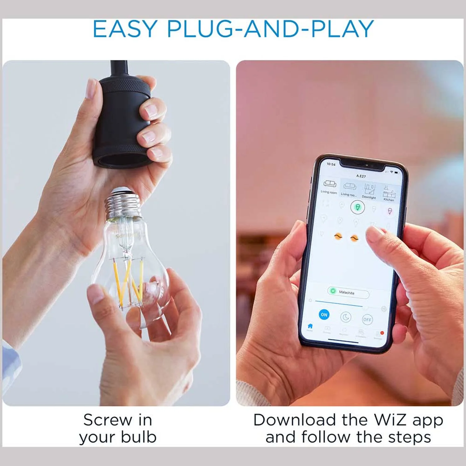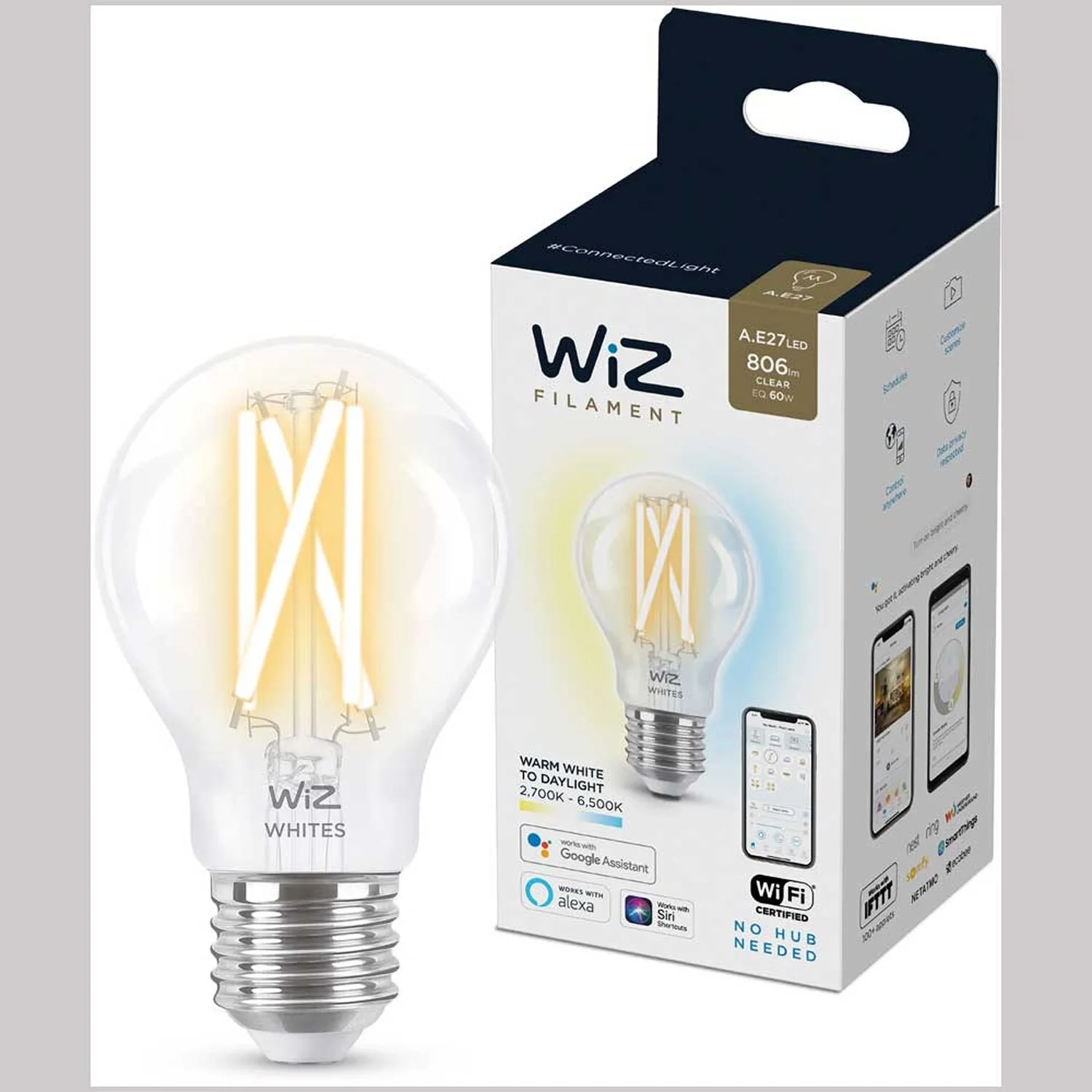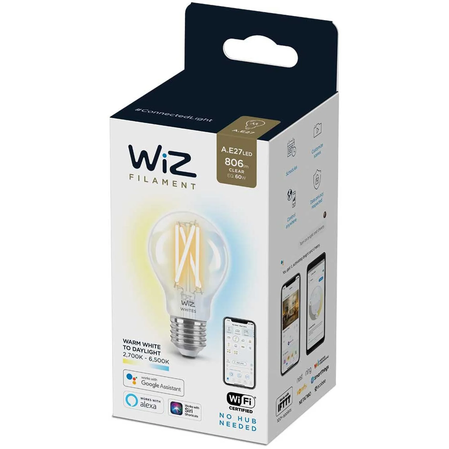 Mit dem smarten WiZ LED-Leuchtmittel E27 Standardform WiFi Bluetooth klar holen Sie sich das ultimative Lichterlebnis in Ihr Zuhause. Die patentierte WiZ-Technologie ermöglicht Ihnen die volle Kontrolle über alle Lampen – egal ob sie über WLAN, mobile Datennetze, die Infrarot-Fernbedienung oder die vorhandenen Schalter erfolgt. Schaffen Sie das Ambiente Ihrer Wahl mit warm- bis tageslichtweissem Licht (2’700 – 6’500 K) – je nachdem ob Sie sich konzentrieren oder entspannen wollen. Sie können Routinen zum Ein- und Ausschalten des Lichts für Ihre täglichen oder wöchentlichen Aktivitäten einrichten, oder das Licht mit Ihrem Smartphone oder Ihrer Stimme steuern.
